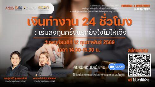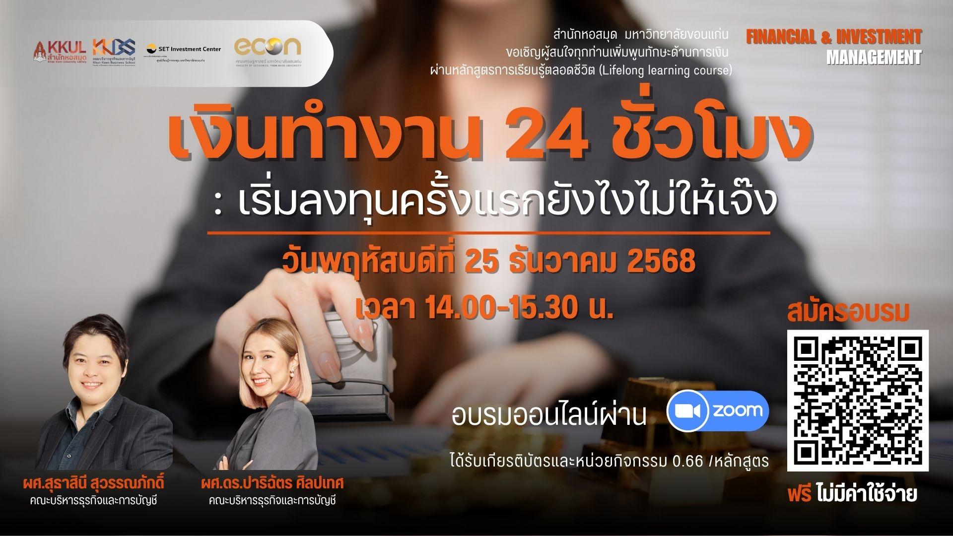 สำนักหอสมุด มหาวิทยาลัยขอนแก่น ขอเชิญผู้สนใจทุกท่านเพิ่มพูนทักษะการเงินการลงทุนผ่านอบรมหลักสูตรการเรียนรู้ตลอดชีวิต (Lifelong learning course) หลักสูตรที่ 1 Financial & Investment Management EP.2 พบกับหัวข้อ เงินทำงาน 24 ชั่วโมง: เริ่มลงทุนครั้งแรกยังไงไม่ให้เจ๊ง วิทยากรโดย ผศ.สุธาสินี สุวรรณภักดิ์ และรศ.ดร.ปาริฉัตร ศิลปเทศ คณะบริหารธุรกิจและการบัญชี ในวันพฤหัสบดีที่ 12 กุมภาพันธ์ 2569 เวลา 14.00-15.30 น. ด้วยระบบออนไลน์ผ่าน Zoom Meeting