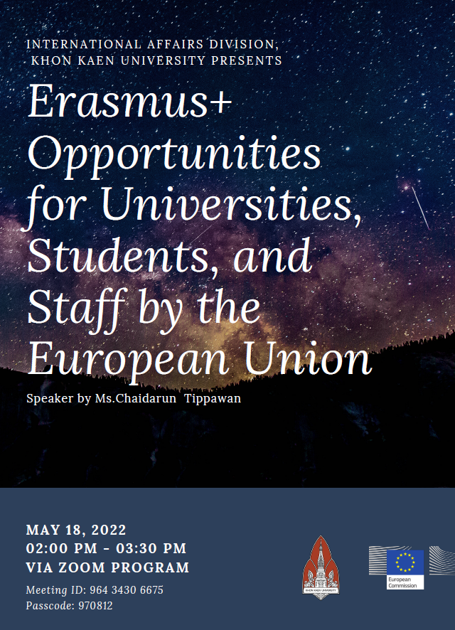 กองการต่างประเทศ ขอเชิญอาจารย์ นักวิจัย นักศึกษา เจ้าหน้าที่วิเทศสัมพันธ์ ผู้ปฏิบัติงานรับผิดชอบงานด้านวิเทศสัมพันธ์ ฟังการบรรยายทุนออนไลน์ ในหัวข้อ “Erasmus+ Opportunities for Universities, Students, and Staff by the European Union” ในวันพุธที่ 18 พฤษภาคม 2565 เวลา 13.30-15.30 น. ผ่านระบบ ZOOM ได้ที่ https://kku.world/7cifd หรือ Meeting ID: 964 3430 6675 Passcode: 970812