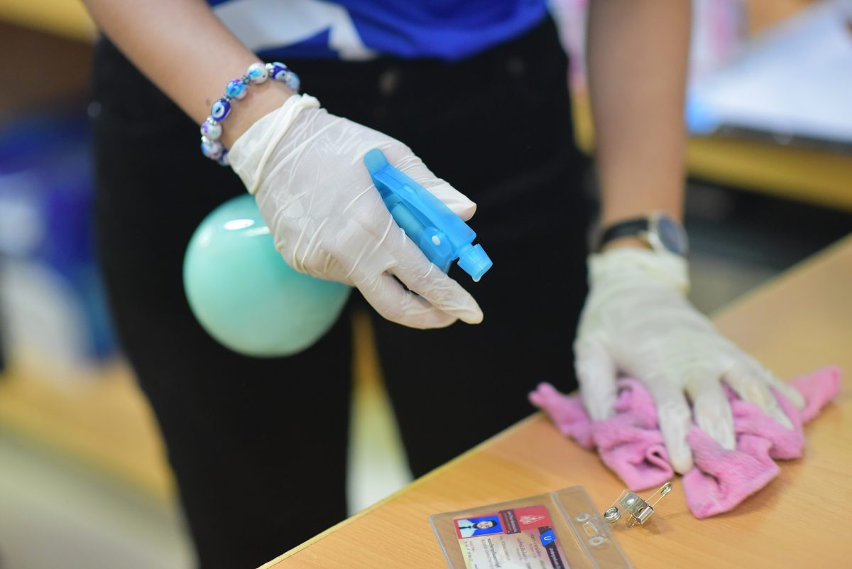 3. ทำความสะอาดโต๊ะบรรยาย โต๊ะเรียน เก้าอี้ ประตู สวิสต์ไฟ ลูกบิด เป็นต้น และจุดที่มีการสัมผัสที่ในห้องเรียน ตามลำดับ