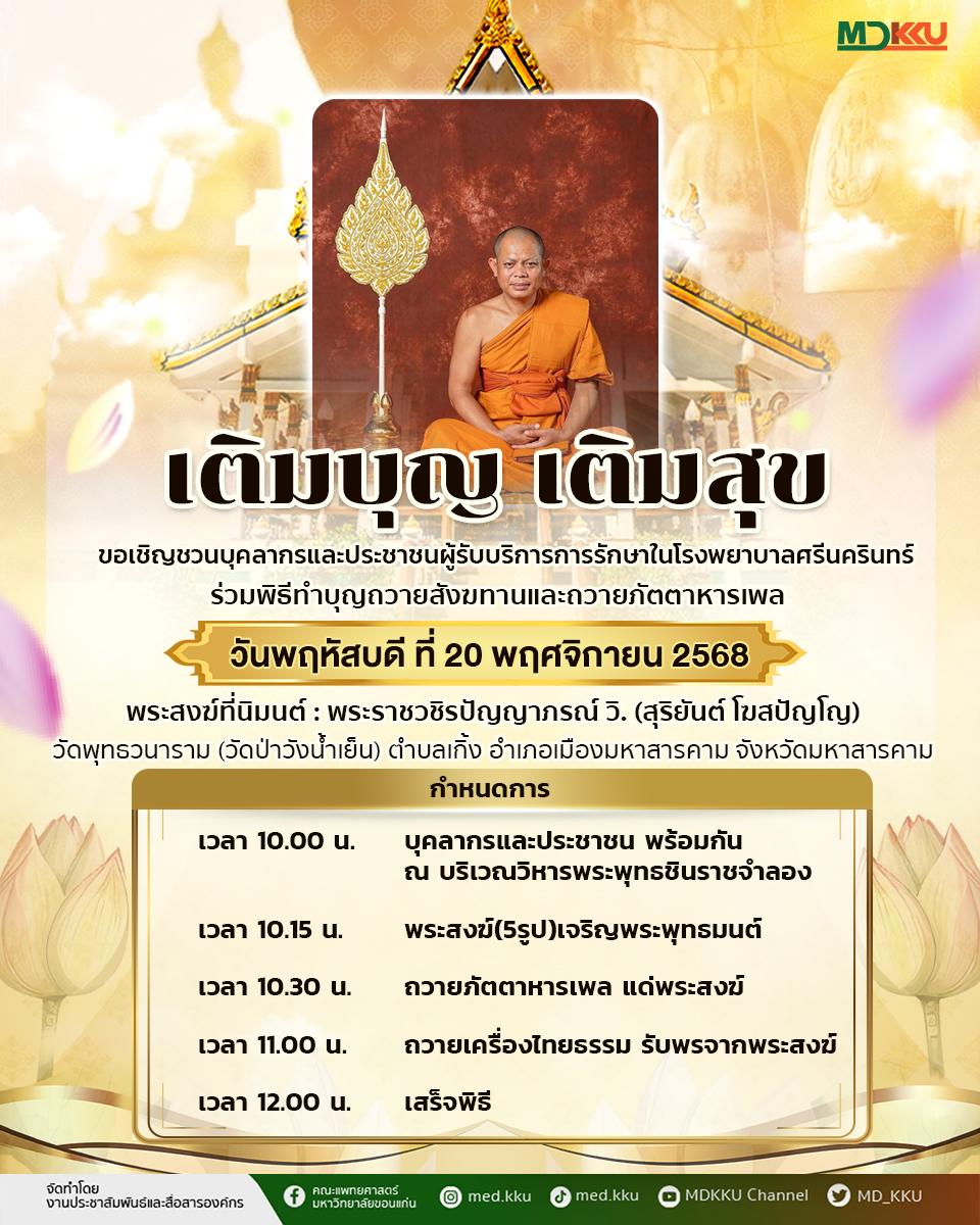 ขอเชิญชวนบุคลากรและประชาชนผู้รับบริการการรักษาในโรงพยาบาลศรีนครินทร์ ร่วมพิธีทำบุญถวายสังฆทานและถวายภัตตาหารเพล