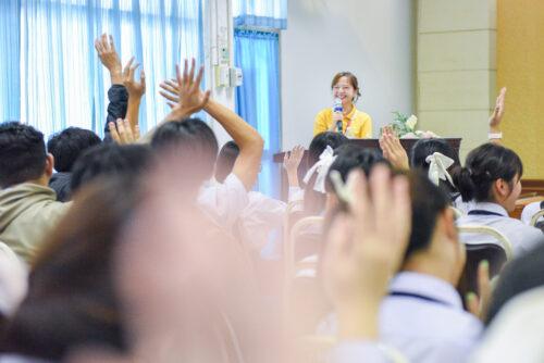 The program continued with a special interactive session titled “Creative Student Welcoming,” organized by the Khon Kaen University Student Organization. Mr. Sorawit Tangpakdee, President of the Student Organization, and his team shared their personal experiences of student life, extracurricular skill-development activities, and mentorship networks. This session aimed to inspire high school students by offering real insights into university life and future study pathways.