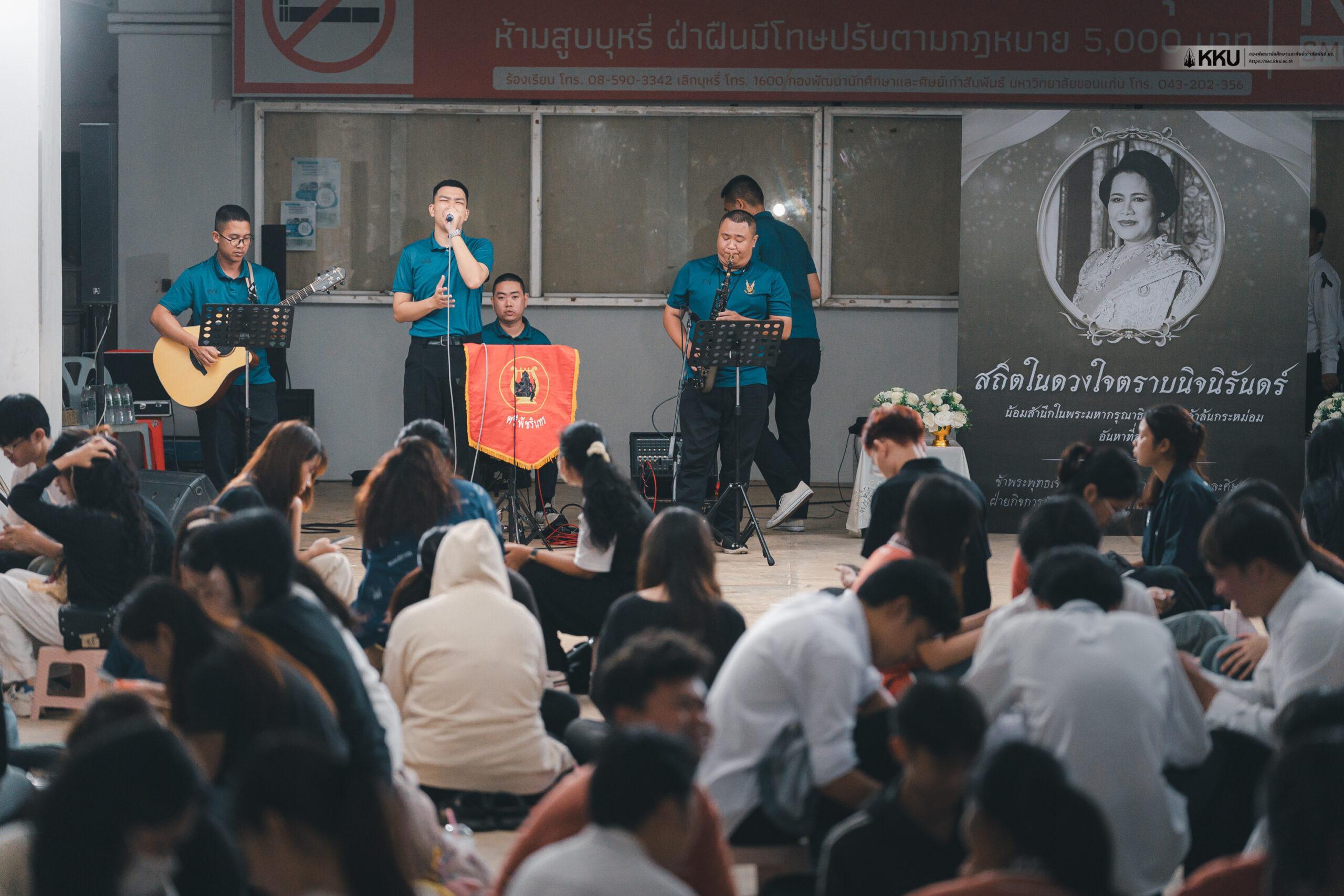 The Student Affairs and Alumni Relation Division, Khon Kaen University (KKU), in collaboration with the 23rd Military District (23MD) and the Mental Health Center 7 Khon Kaen, organised the “Music for Mood” event. The activity provided a space for students and staff to relieve stress while commemorating the profound royal benevolence of Her Majesty Queen Sirikit The Queen Mother. The event took place at the KKU Morecare Centre activity area, Student Affairs and Alumni Relation Division.