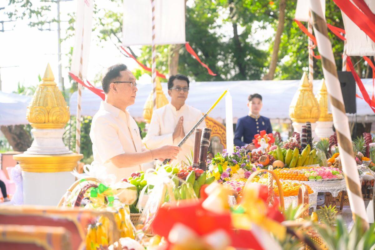 At 08:09 hrs, Assoc. Prof. Charnchai Panthongviriyakul, M.D., the President of Khon Kaen University and Chair of the ceremony, presided over the rites. The President began by changing the ceremonial robe (Angsa) of the Phra Phuttha Panya Metta Tham Buddha image and lighting joss sticks and candles to pay homage to the Triple Gem and Chaopho Mor Din Daeng. The President then placed joss sticks at the main offering table and the censer for the ancillary spirits, offering a prayer.