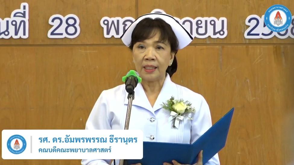 Associate Professor Dr. Ampornpan Theeranut, Dean of the Faculty of Nursing, Khon Kaen University, stated, “On behalf of the Faculty of Nursing, I would like to congratulate and warmly welcome everyone to be a part of the nursing profession. Receiving the cap and gown today marks a significant beginning for the practical learning journey of our students. The nursing cap symbolizes humility, modesty, and a readiness to care for and assist others at all times. It makes the wearer aware of their roles, duties, and responsibilities, and to conduct themselves appropriately according to the professional ethics of nursing, just like Miss Florence Nightingale, the English lady known as ‘The Lady with the Lamp,’ who dedicated her life to nursing. Every night, she would carry a lamp to visit and care for injured soldiers, and the light from her lamp was like a beacon that dispelled the darkness and suffering of the patients.”