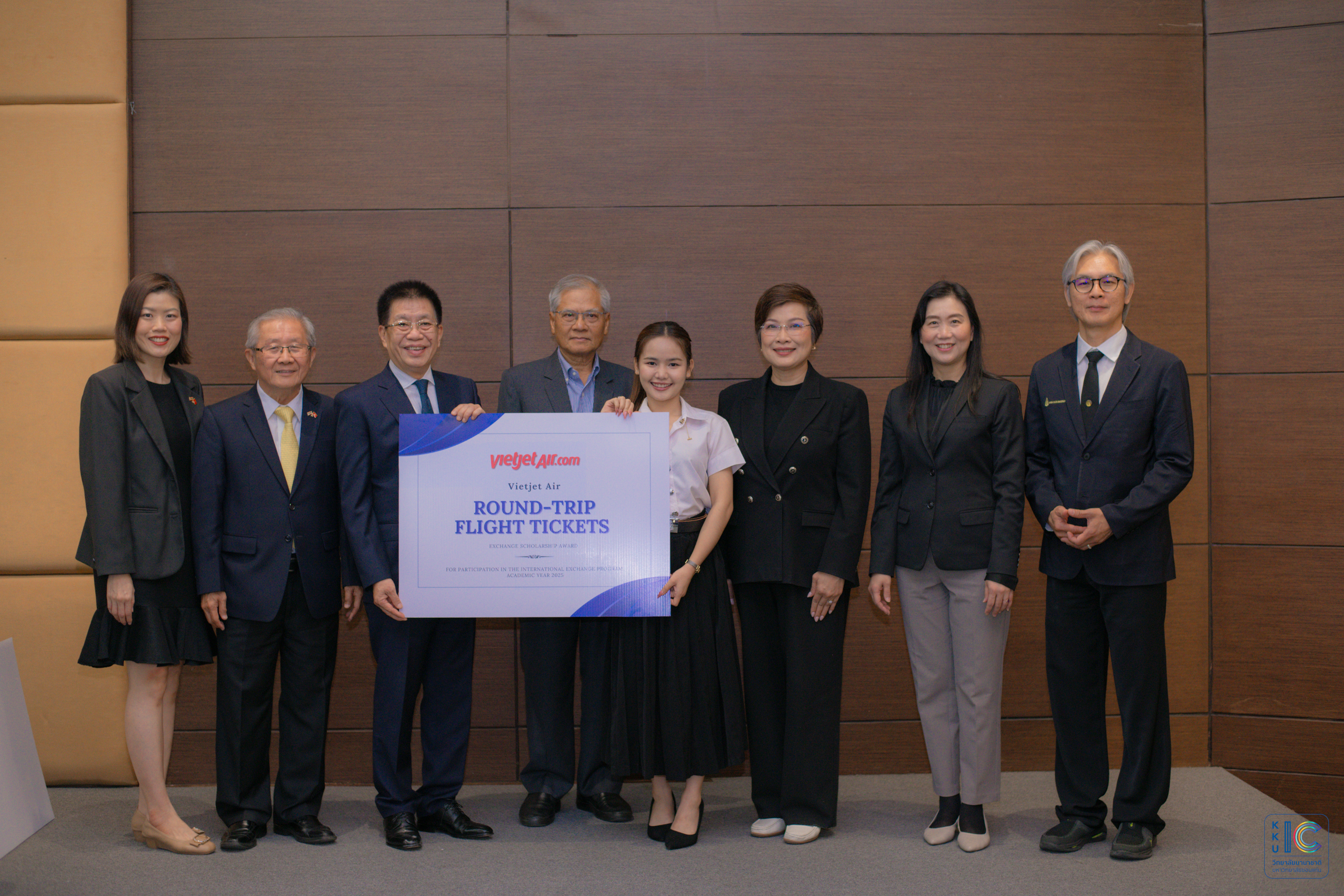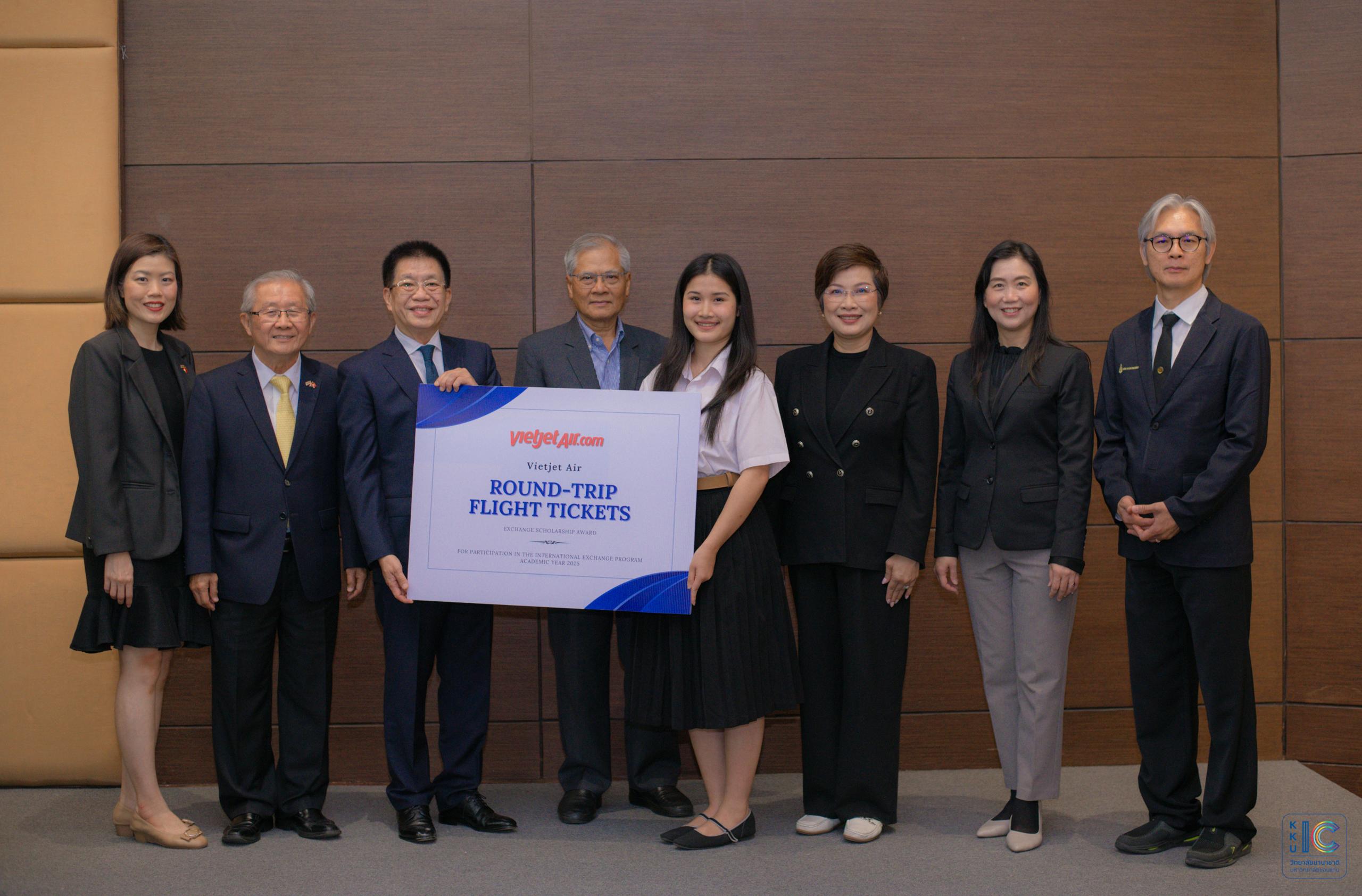 On Wednesday, 17 December 2025, Khon Kaen University (KKU), in collaboration with the College of International Affairs (CIA), held a scholarship award ceremony for the Thailand–Vietnam Exchange Student Programme. The scholarships were generously supported by the Thai–Vietnamese Friendship Association, and the air tickets were sponsored by VietJet Air.