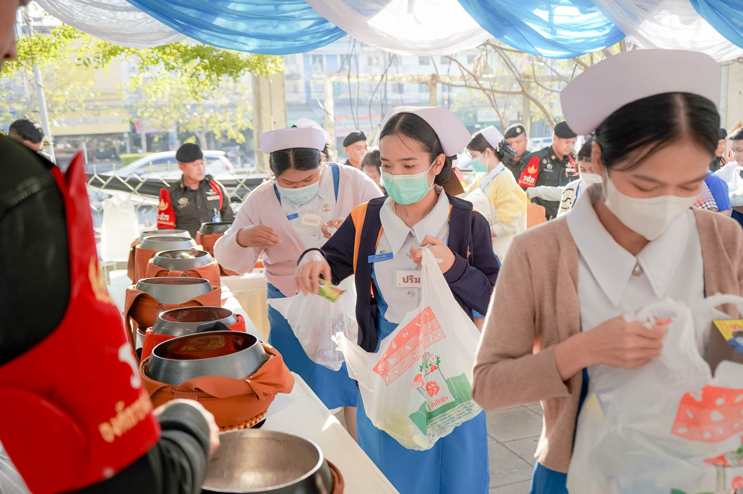 The Auspicious Ceremony to Pay Tribute to His Majesty’s Great Kindness and Grace In the morning at 7:00 a.m., Associate Professor Dr. Chanchai Panthongviriyakul, the president of Khon Kaen University, led the administrative team in a merit-making ceremony with alms offerings to 34 monks at the front courtyard of the Samrit Phra Haritthai. (East side adjacent to Mittraphap Road)
