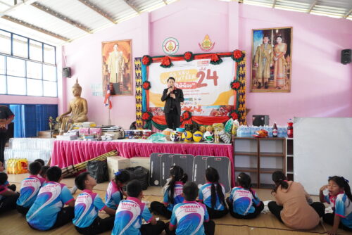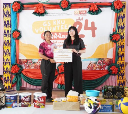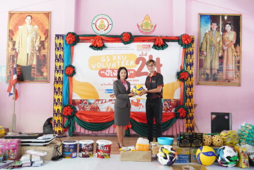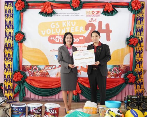 Professor Kiatichai Faksri, Dean of the Graduate School, presided over the handover ceremony. He remarked that the program reflects the university’s commitment to providing academic service to society and instilling a sense of social responsibility in graduate students. Ms. Ketsuda Buadee, Director of Ban Tum Huay School, expressed gratitude for the 24th GS Volunteer ‘Phi Hai Nong’ program from the Graduate School, accepting donations, scholarships from benefactors, learning materials, sports equipment, and agricultural tools.