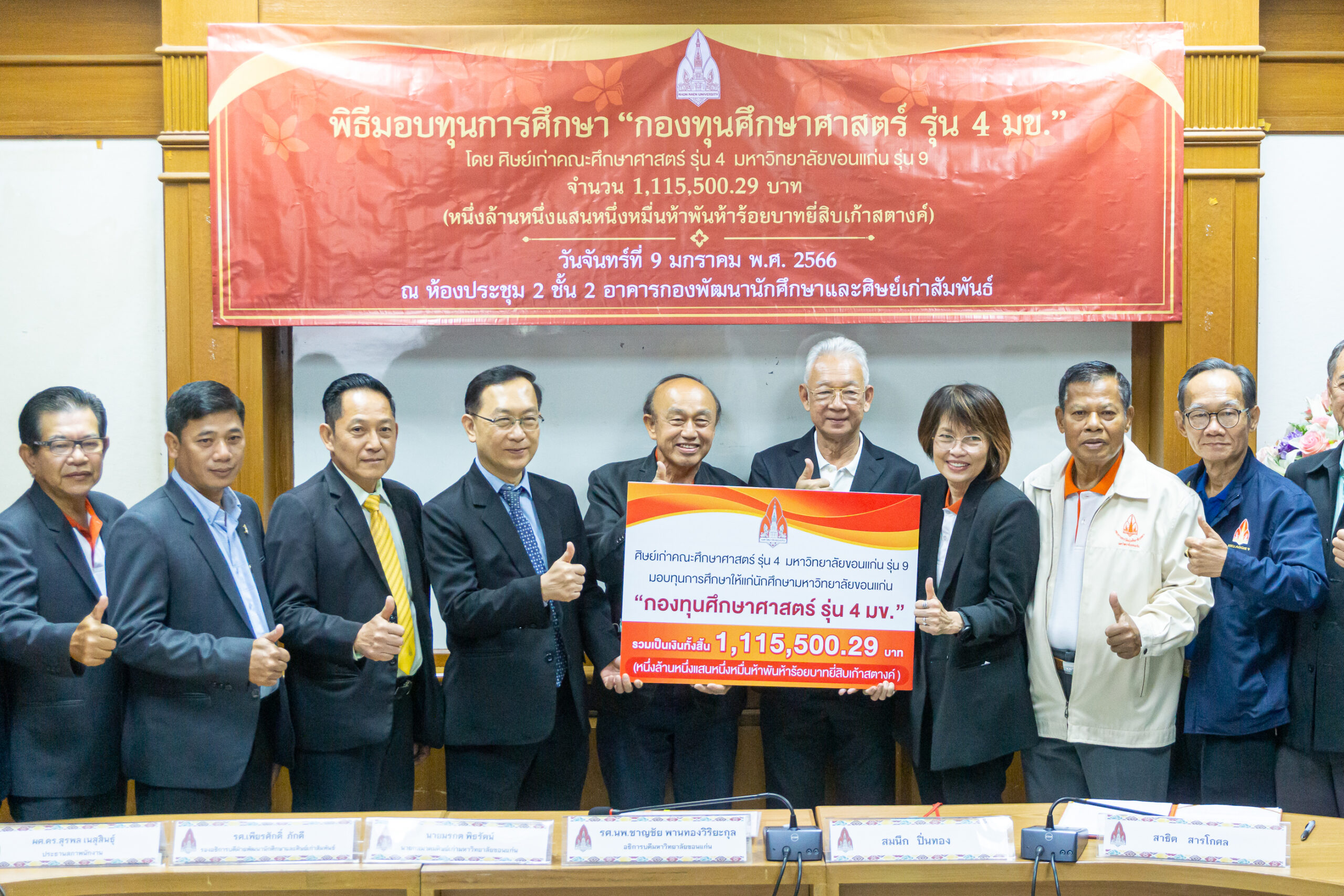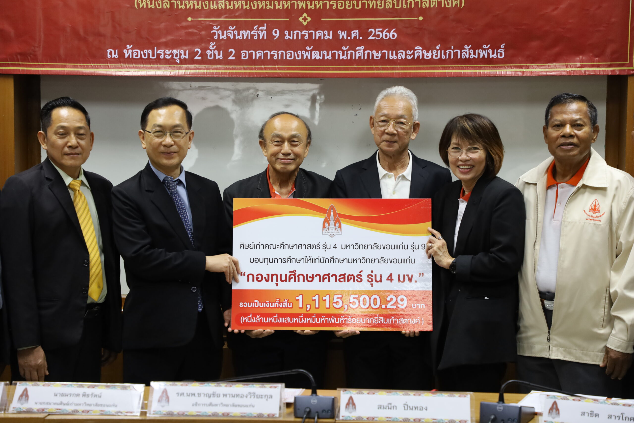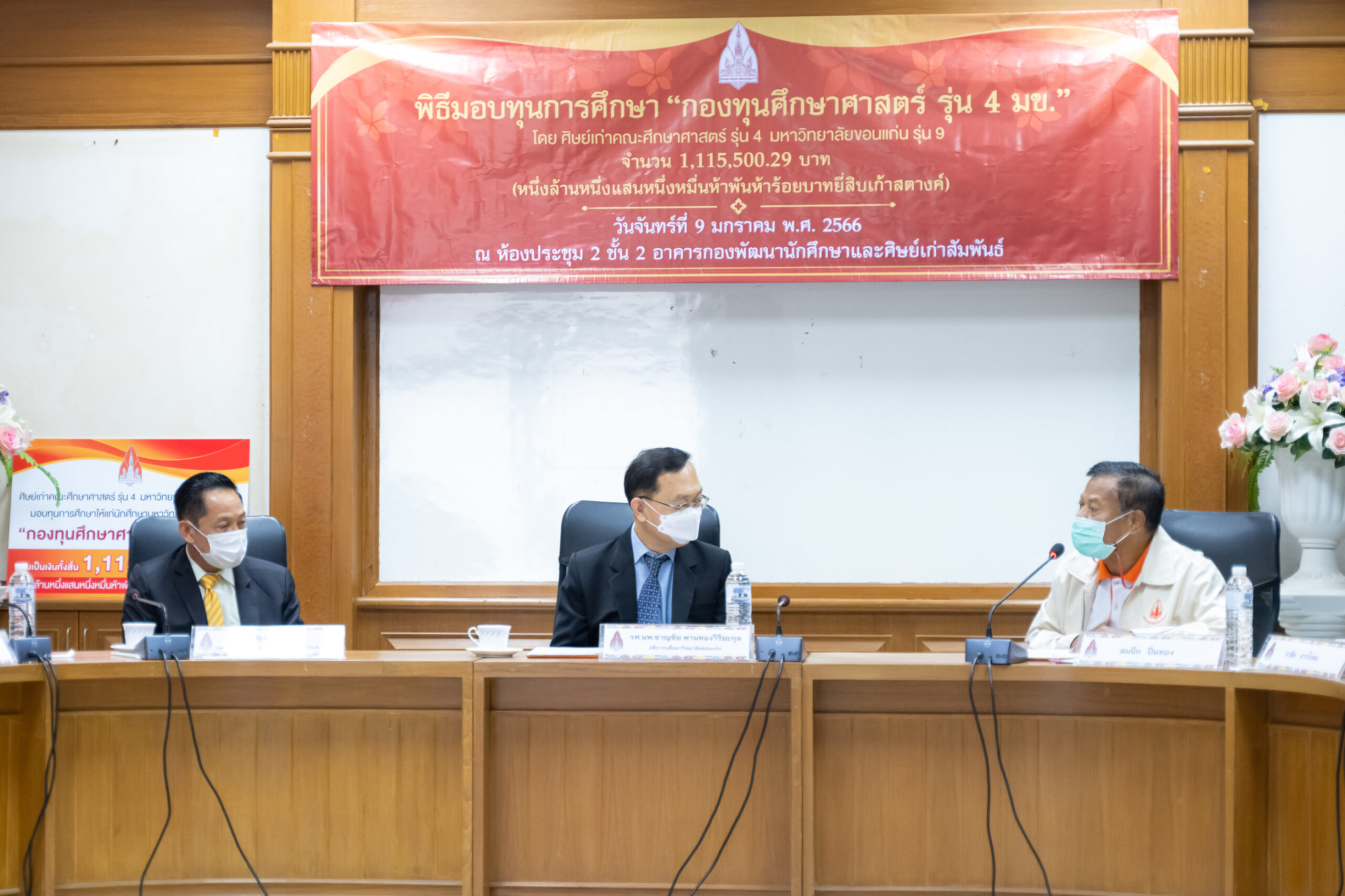 เมื่อวันที่ 9 มกราคม 2566 เวลา 15.00 น. รศ.นพ.ชาญชัย พานทองวิริยะกุล อธิการบดีมหาวิทยาลัยขอนแก่น รับมอบทุนการศึกษา ในพิธีมอบทุนการศึกษา กองทุนศึกษาศาสตร์ รุ่น 4 มข. โดยมี ผู้อำนวยการสมนึก ปิ่นทอง อดีตผู้อำนวยการกองกิจการนักศึกษา ประธานกองทุนศิษย์เก่าคณะศึกษาศาสตร์ รุ่น 4 เป็นประธานส่งมอบ และมีอธิการบดีเป็นประธานรับมอบทุนการศึกษาแก่มหาวิทยาลัยขอนแก่น เป็นเงินจำนวน 1,115,500.29 บาท ทั้งนี้ได้รับเกียรติจากผู้บริหารมหาวิทยาลัย และตัวแทนพี่ศิษยเก่าคณะศึกษาศาสตร์รุ่น 4 ร่วมงานจำนวนมาก ณ ห้องประชุม ชั้น 2 อาคารกองพัฒนานักศึกษาและศิษย์เก่าสัมพันธ์