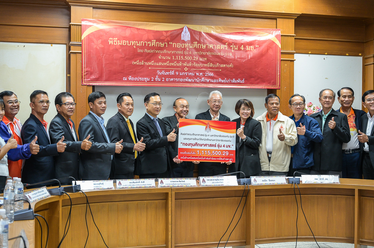 ผู้อำนวยการสมนึก ปิ่นทอง อดีตผู้อำนวยการกองกิจการนักศึกษา ประธานกองทุนศิษย์เก่าคณะศึกษาศาสตร์ รุ่น 4 เผยว่า กองทุนศึกษาศาสตร์ รุ่น 4 มข. จัดตั้งมานาน ตั้งแต่ตนเคยเป็นผู้อำนวยการกองพัฒนานักศึกษา ได้เคยลงพื้นที่เยี่ยมนักศึกษาตามภูมิลำเนาต่าง ๆ ทั่วภาคอีสาน เกือบทุกจังหวัด ทุกอำเภอ เมื่อมองถึงข้อจำกัด อาทิ ค่าใช้จ่าย การเดินทาง ความเป็นอยู่ ทำให้นักศึกษาหลายคนไม่มีโอกาสศึกษาเล่าเรียนอย่างที่ตั้งใจ จึงชักชวนเพื่อน ๆ ร่วมรุ่นระดมทุนการศึกษา และตั้งใจว่าเมื่อจำนวนเงินถึง 1 ล้านบาท จะนำส่งมอบแก่มหาวิทยาลัย วันนี้ถึงเป้าหมายแล้วจึงชักชวนเพื่อน ๆ รวมส่งมอบเงินทั้งสิ้น จำนวน 1115500.29 สตางค์ เพื่อใช้เป็นประโยชน์ต่อการศึกษาของน้อง ๆ ส่งมอบโอกาสคืนแก่น้องนักศึกษา หวังให้เขากลายเป็นเด็กดีตอบแทนสังคม และมอบโอกาสเช่นนี้คืนสู่น้อง ๆ รุ่นต่อไปเพื่อประโยชน์แก่สังคมต่อไป