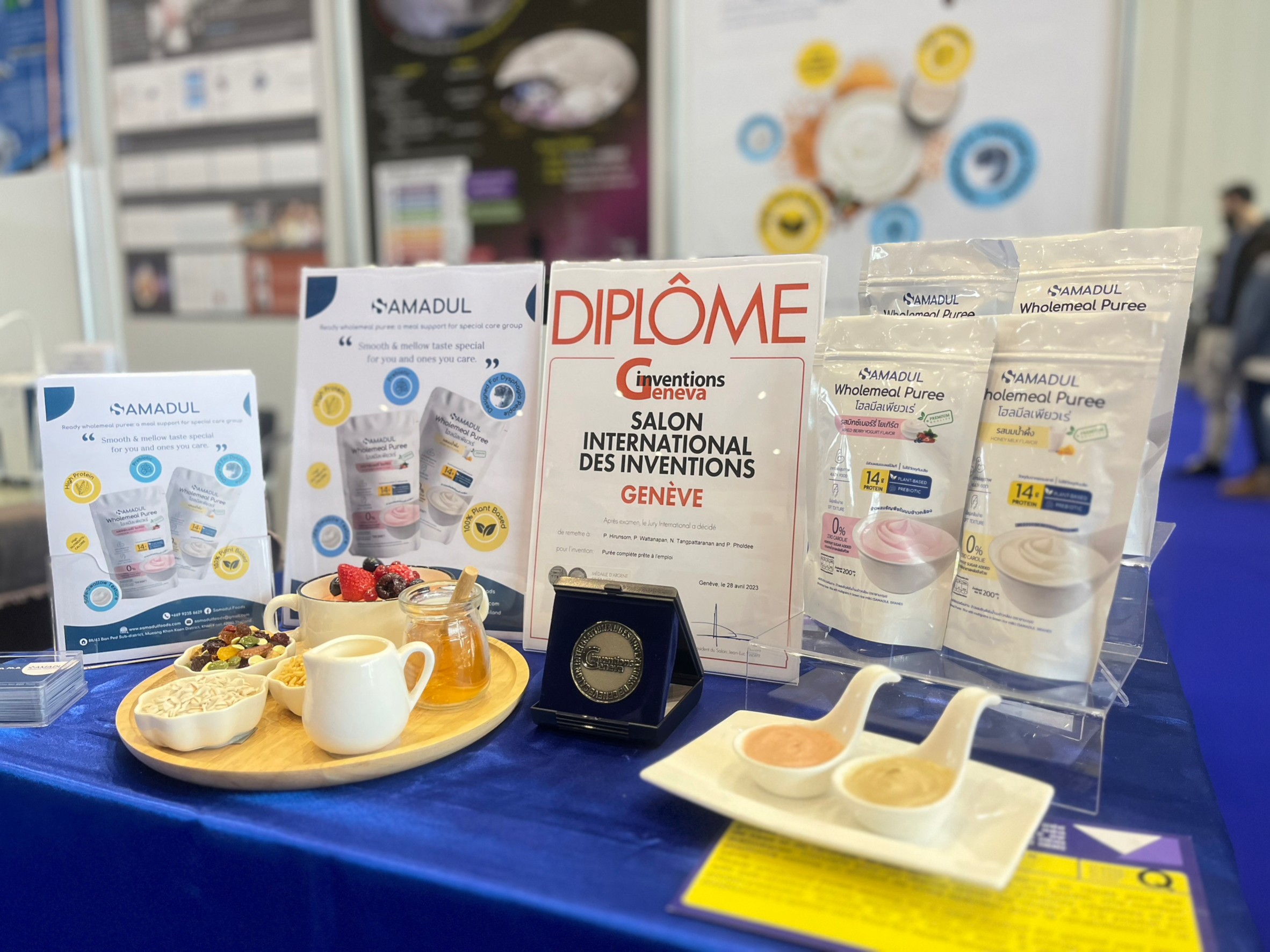 รางวัลเหรียญเงิน Silver Medal ประเภท : Foodstuffs – Drinks – Cosmetics – Paramedical – Health – Hygiene จากผลงาน “อาหารเพียรเร่โฮลมีลนุ่นพร้อมทานสำหรับผู้ต้องการการดูแลเป็นพิเศษ (Ready wholemeal puree for special care group)” โดย ดร. พิมพ์นิภา หิรัณย์สร แพทย์หญิงภัทรา วัฒนพันธุ์ นางสาวนหทัย ตั้งภัทรนันท์ และนางสาวปาณิสรา พลดี