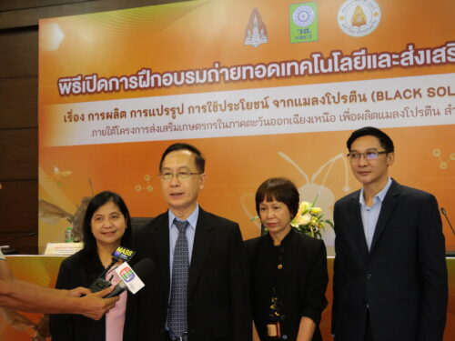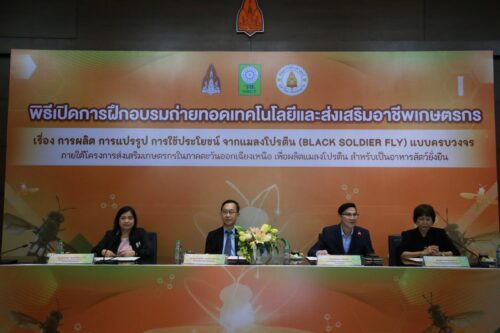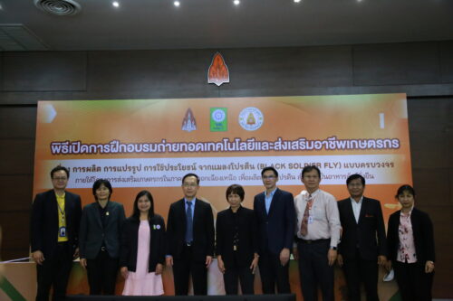 วันอังคารที่ 30 พฤษภาคม 2566 มหาวิทยาลัยขอนแก่น จัดพิธีเปิดการฝึกอบรมถ่ายทอดเทคโนโลยีและส่งเสริมอาชีพเกษตรเรื่อง การผลิต การแปรรูป การใช้ประโยชน์ จากแมลงโปรตีน (Black Soldier Fly) แบบครบวงจร ภายใต้โครงการ การส่งเสริมเกษตรกรในภาคตะวันออกเฉียงเหนือเพื่อผลิตแมลงโปรตีนสำหรับเป็นอาหารสัตว์อย่างยั่งยืน โดยมี รศ.นพ. ชาญชัย พานทองวิริยะกุล อธิการบดีมหาวิทยาลัยขอนแก่น เป็นประธานในพิธี พร้อมด้วย รองศาสตราจารย์ปรเมศ บรรเทิง รองคณบดีฝ่ายวิจัย นวัตกรรมและการต่างประเทศ คณะเกษตรศาสตร์ ศาสตราจารย์ยุพา หาญบุญทรง หัวหน้าโครงการฯ และ คุณสุภาพร โชคเฉลิมวงศ์ ผู้อำนวยการกองบริหารทุนวิจัยและนวัตกรรม 1 สำนักงานการวิจัยแห่งชาติ (วช.) ในการนี้มีผู้บริหาร คณบดี ตัวแทนคณะหน่วยงานร่วมงาน ณ ห้องประชุมสารสิน ชั้น 2 อาคารสิริคุณากร มหาวิทยาลัยขอนแก่น และหมวดแมลงอุตสาหกรรม มหาวิทยาลัยขอนแก่น