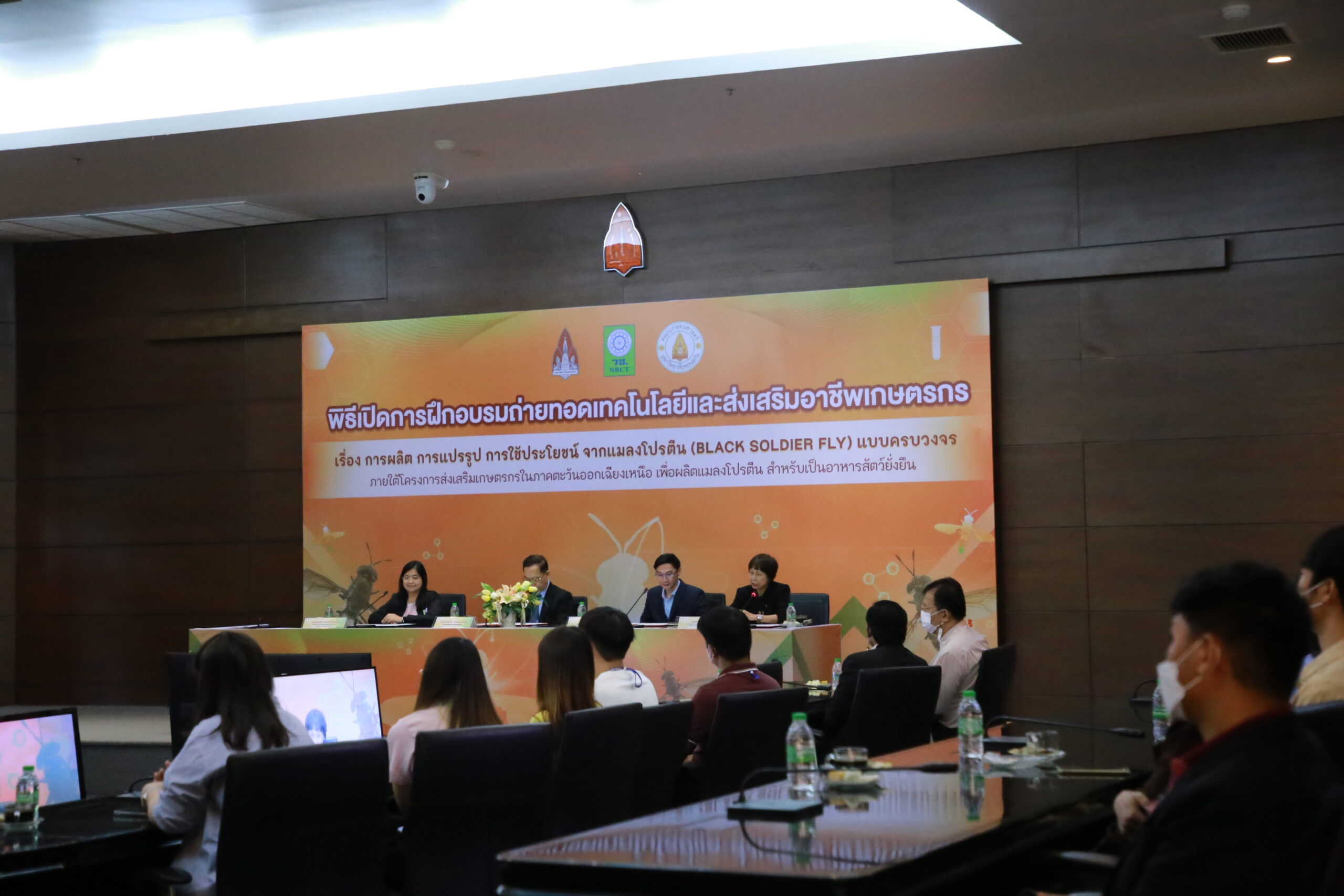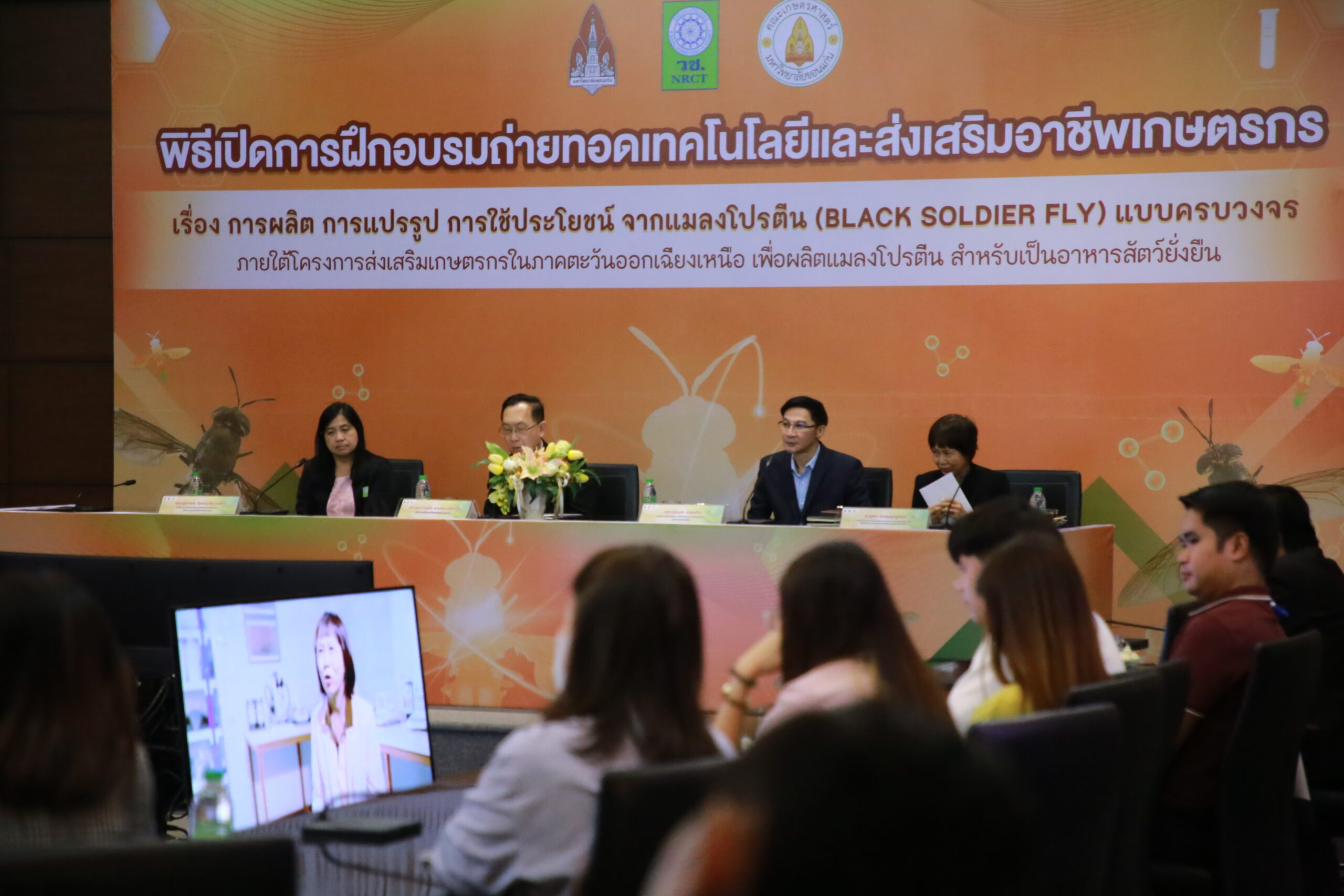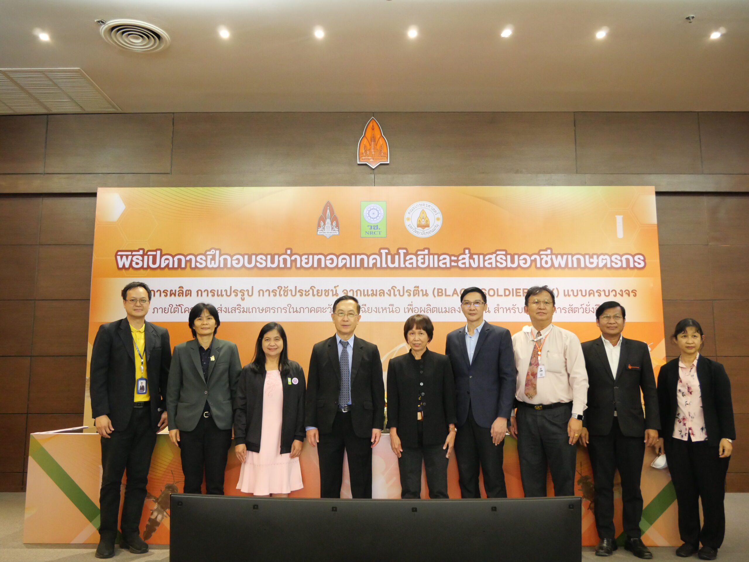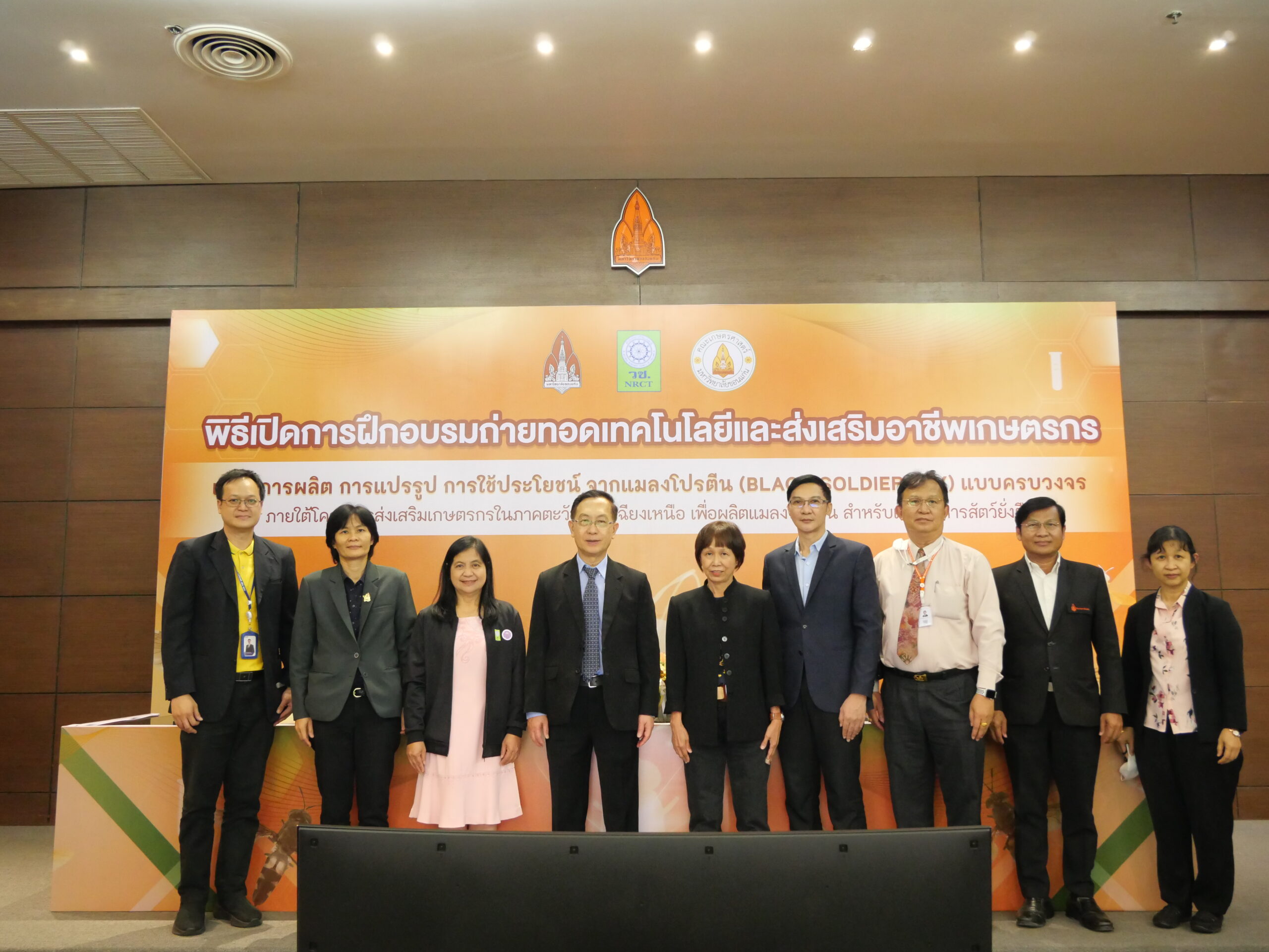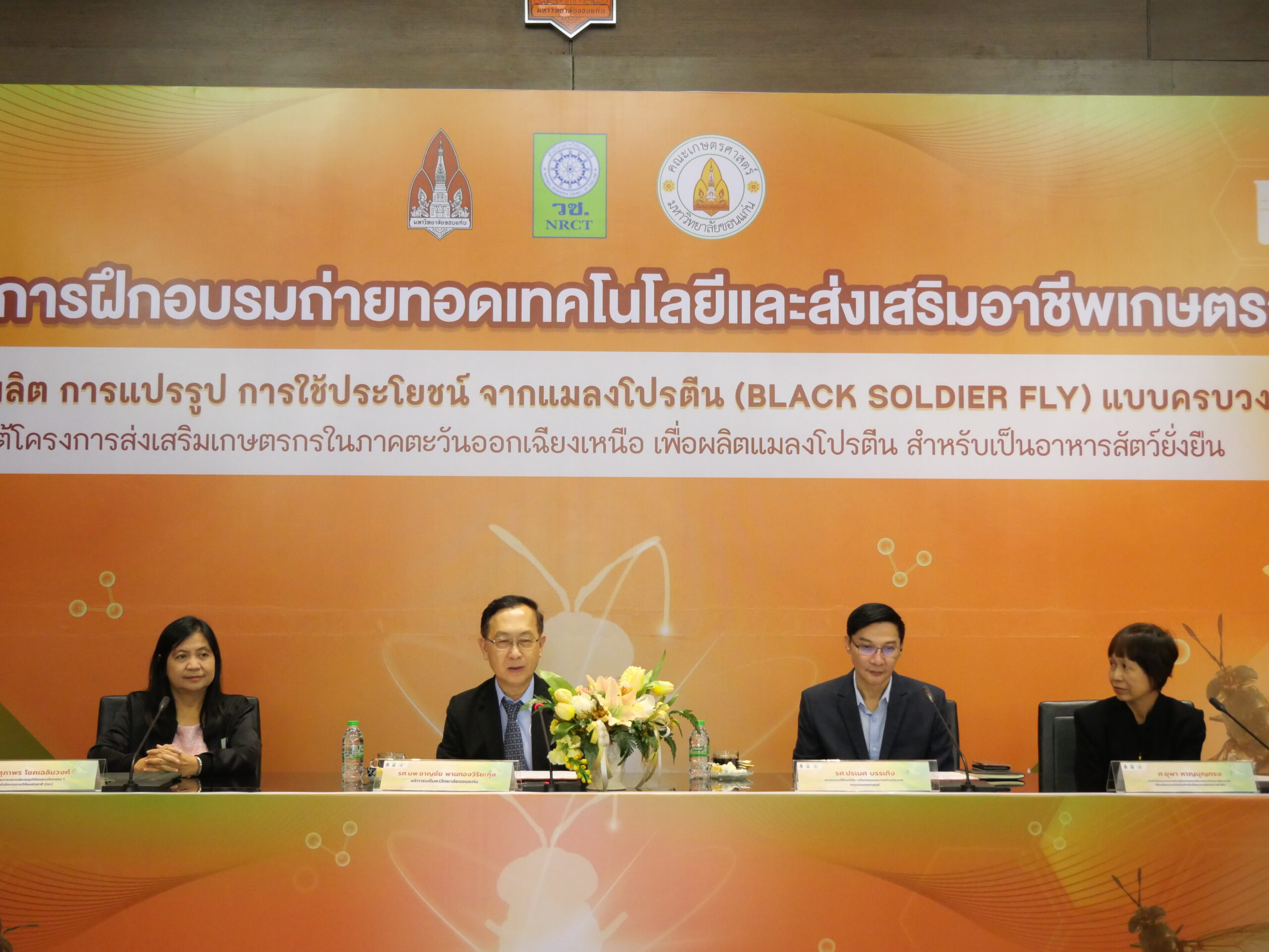 วันอังคารที่ 30 พฤษภาคม 2566 มหาวิทยาลัยขอนแก่น จัดพิธีเปิดการฝึกอบรมถ่ายทอดเทคโนโลยีและส่งเสริมอาชีพเกษตรเรื่อง การผลิต การแปรรูป การใช้ประโยชน์ จากแมลงโปรตีน (Black Soldier Fly) แบบครบวงจร ภายใต้โครงการ การส่งเสริมเกษตรกรในภาคตะวันออกเฉียงเหนือเพื่อผลิตแมลงโปรตีนสำหรับเป็นอาหารสัตว์อย่างยั่งยืน โดยมี รศ.นพ. ชาญชัย พานทองวิริยะกุล อธิการบดีมหาวิทยาลัยขอนแก่น เป็นประธานในพิธี พร้อมด้วย รองศาสตราจารย์ปรเมศ บรรเทิง รองคณบดีฝ่ายวิจัย นวัตกรรมและการต่างประเทศ คณะเกษตรศาสตร์ ศาสตราจารย์ยุพา หาญบุญทรง หัวหน้าโครงการฯ และ คุณสุภาพร โชคเฉลิมวงศ์ ผู้อำนวยการกองบริหารทุนวิจัยและนวัตกรรม 1 สำนักงานการวิจัยแห่งชาติ (วช.) ในการนี้มีผู้บริหาร คณบดี ตัวแทนคณะหน่วยงานร่วมงาน ณ ห้องประชุมสารสิน ชั้น 2 อาคารสิริคุณากร มหาวิทยาลัยขอนแก่น และหมวดแมลงอุตสาหกรรม มหาวิทยาลัยขอนแก่น