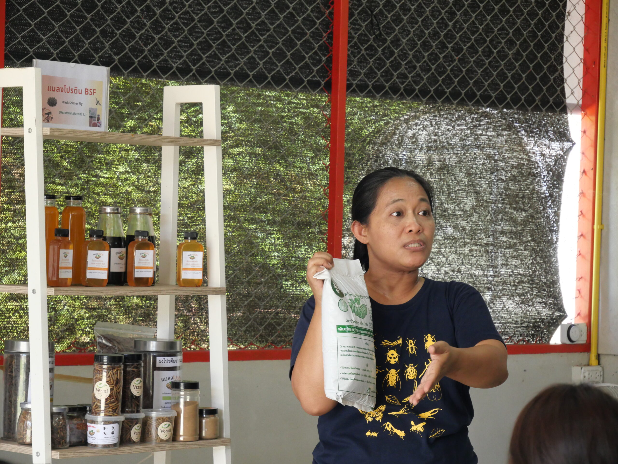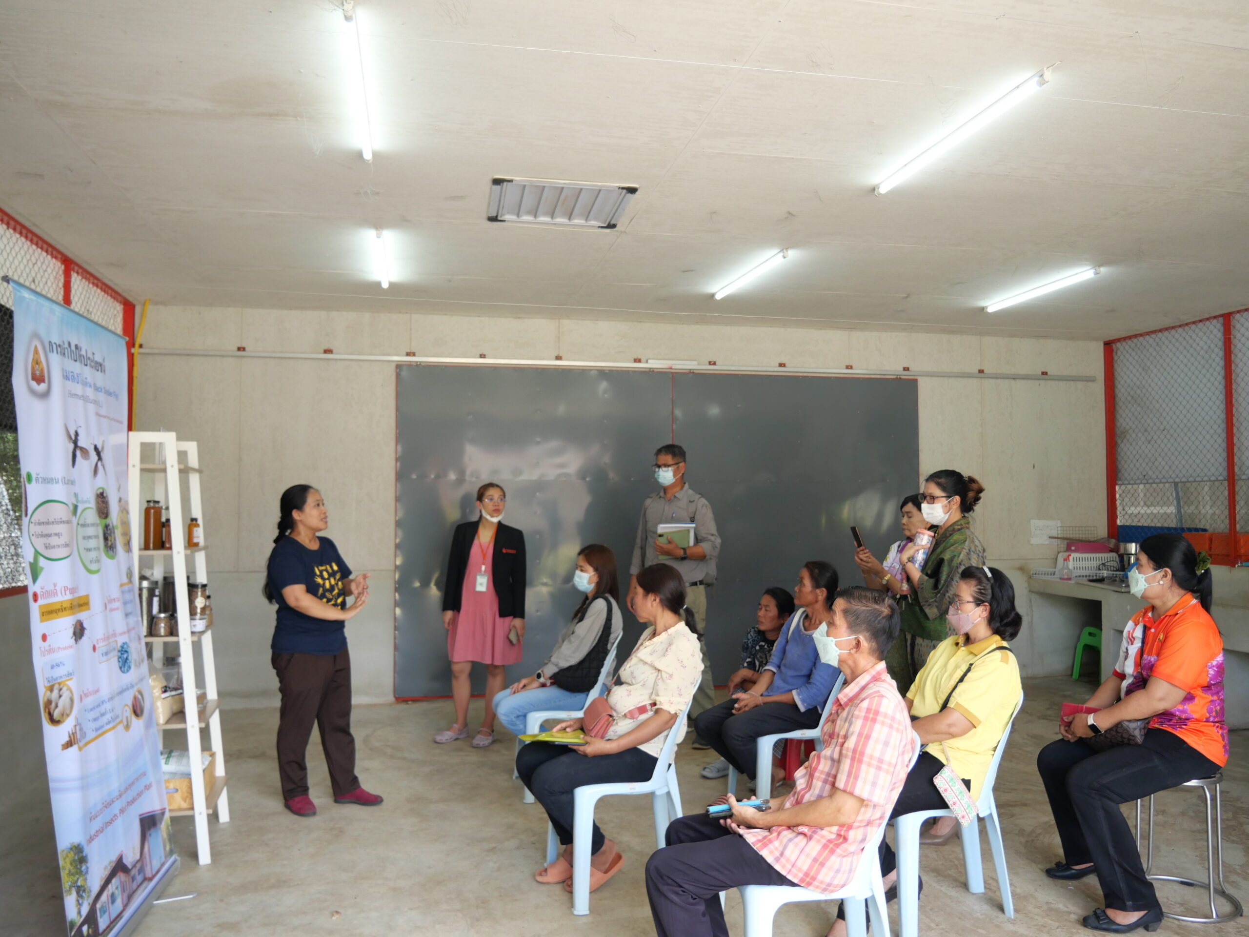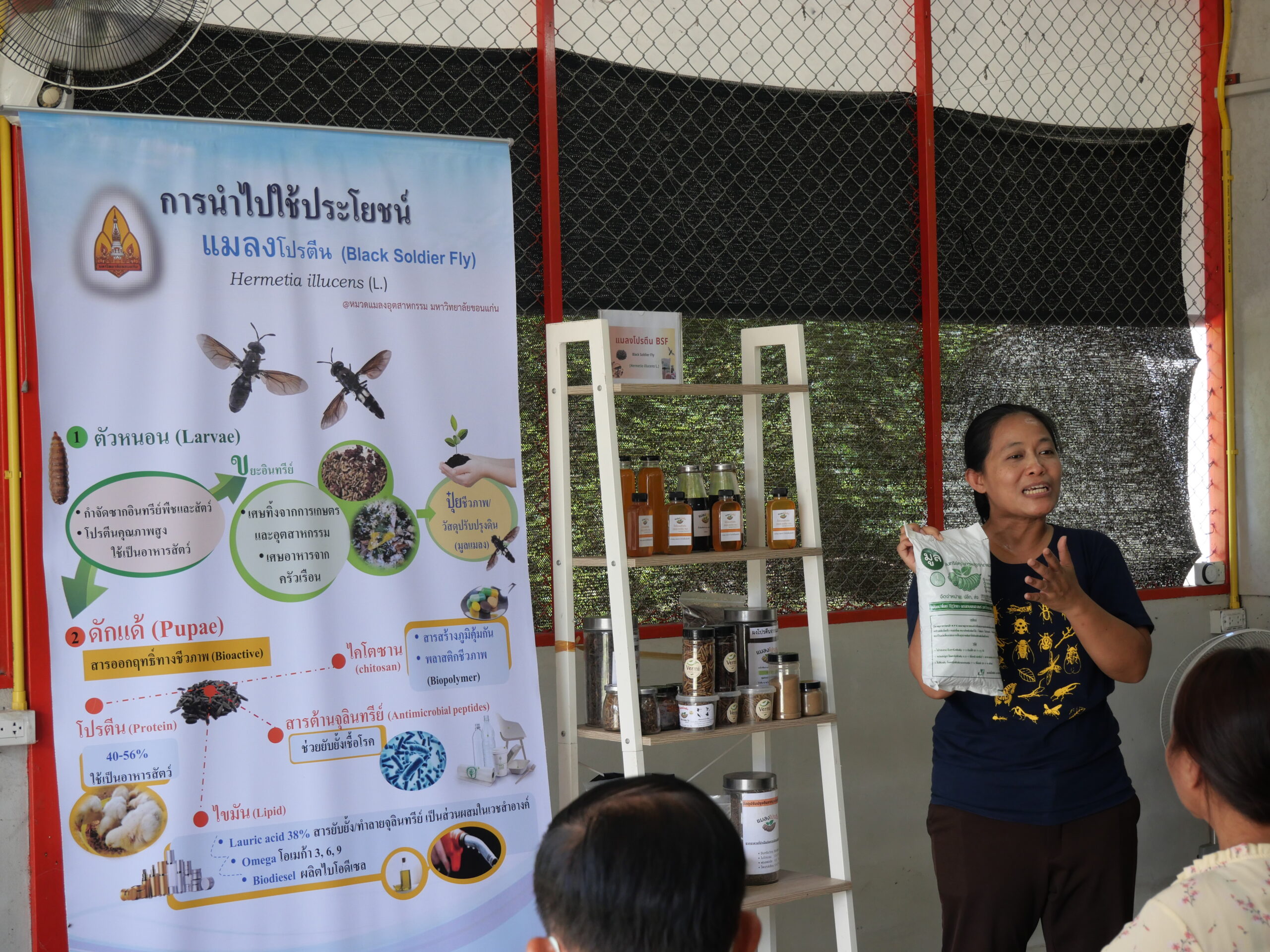 “มีการจัดฝึกอบรม ณ โรงเรือนต้นแบบโรงเรือนต้นแบบการวิจัยและการผลิตแมลงอุตสาหกรรมแบบครบวงจร จำนวน 4 รุ่น รุ่นละ 25 คน ในแต่ละรุ่นดำเนินการฝึกอบรม เป็นระยะเวลา 2 วัน เป็นการบรรยายให้ความรู้เกี่ยวกับการเพาะเลี้ยงและผลิตแมลงโปรตีน การใช้ประโยชน์ และการแปรรูปจากแมลงโปรตีน พร้อมกับให้ผู้เข้าฝึกอบรมได้ฝึกปฏิบัติจริงด้วยตัวเองในแต่ละขั้นตอนของการผลิตเลี้ยงแมลงแบบครบวงจรอีกด้วย”