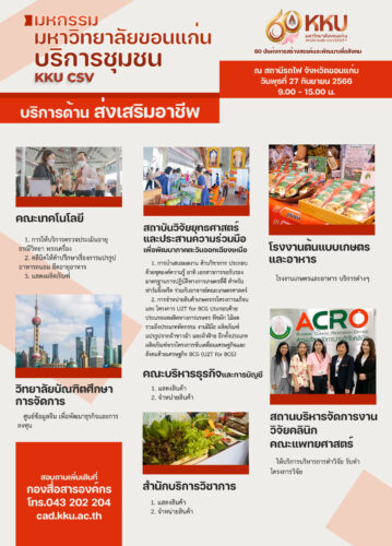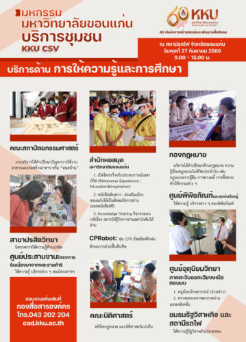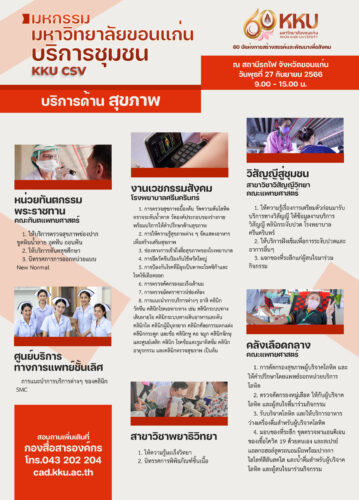 มหกรรมมหาวิทยาลัยขอนแก่นบริการชุมชน KKU CSV หรือ Creating Shared Value จัดขึ้นในวาระครบรอบ 60 ปีมหาวิทยาลัยขอนแก่นในวันที่ 27 มกราคม 2567 ที่จะถึงนี้ การจัดงานครั้งนี้เพื่อตอกย้ำว่ามหาวิทยาลัยขอนแก่นยังคงมุ่งมั่นตามปรัชญาการอุทิศเพื่อสังคม พบมหกรรมการบริการชุมชน ยิ่งใหญ่กว่าปีที่ผ่านมา ให้บริการฟรีกว่า 32 หน่วยงานทั้งภายใน และหน่วยงานภายนอก ประกอบด้วย
