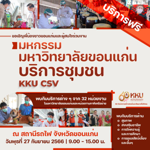มหาวิทยาลัยขอนแก่น ขอเชิญชวนประชาชนชาวจังหวัดขอนแก่น และจังหวัดใกล้เคียง ร่วมมหกรรม KKU CSV “มหาวิทยาลัยขอนแก่นบริการชุมชน” ครั้งที่ 3 โดยมี รศ.นพ.ชาญชัย พานทองวิริยะกุล อธิการบดีมหาวิทยาลัยขอนแก่นเป็นประธานในการเปิดงาน อาจารย์ณัฐสมล ธนกุลรังสฤษดิ์ ผู้ช่วยอธิการบดีฝ่ายกิจการพิเศษ มหาวิทยาลัยขอนแก่น กล่าวรายงานการจัดงาน ณ บริเวณลานชั้น 1 สถานีรถไฟขอนแก่น จังหวัดขอนแก่น