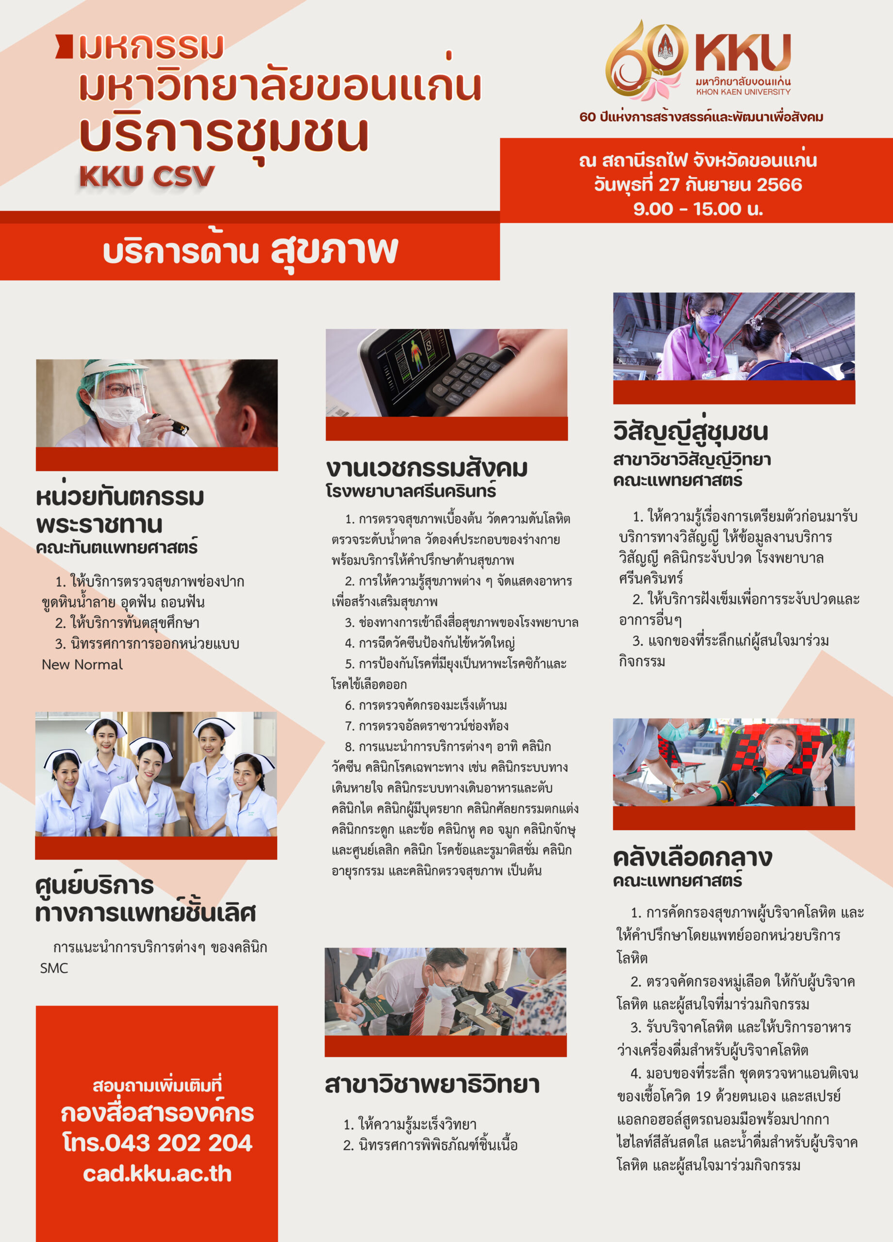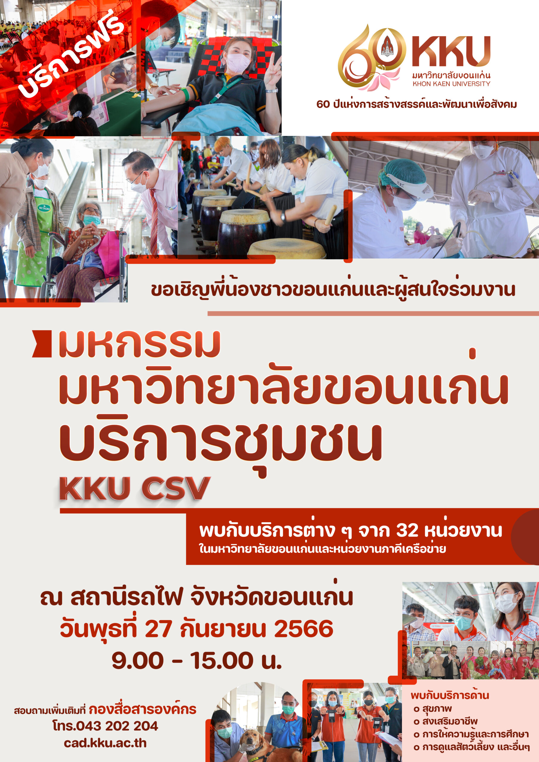 ผู้สนใจเข้าร่วมงาน สามารถลงชื่อเข้ารับบริการฟรี ณ สถานีรถไฟจังหวัดขอนแก่น วันที่ 27 กันยายน 2566 เวลา 9.00 น. – 15.00 น. สอบถามข้อมูลเพิ่มเติมได้ที่กองสื่อสารองค์กร มหาวิทยาลัยขอนแก่น 043 202 204 หรือรายละเอียดตามเอกสารแนบ โปสเตอร์ และทางเพจ Khon Kaen University