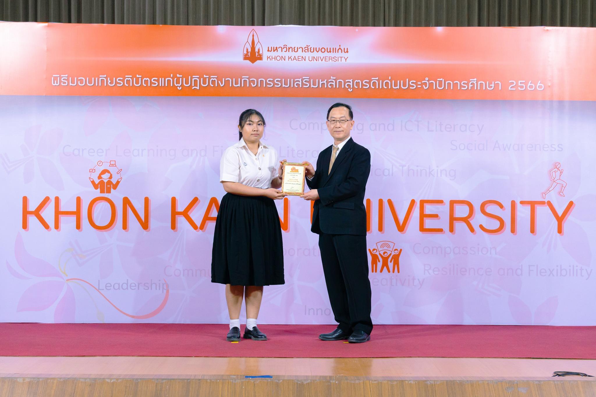มหาวิทยาลัยขอนแก่น โดยฝ่ายพัฒนานักศึกษาและศิษย์เก่าสัมพันธ์ จัดพิธีมอบเกียรติบัตรผู้ปฏิบัติงานกิจกรรมเสริมหลักสูตรดีเด่น ประจำปีการศึกษา 2566 เมื่อวันที่ 1 มีนาคม 2567 ณ ห้องประชุมสายสุรี จุติกุล คณะเกษตรศาสตร์ โดยโอกาสนี้ได้รับเกียรติจาก รองศาสตราจารย์ นพ.ชาญชัย พานทองวิริยะกุล อธิการบดีมหาวิทยาลัยขอนแก่น มาเป็นประธานในพิธี ฯ พร้อมด้วย รองศาสตราจารย์เพียรศักดิ์ ภักดี รองอธิการบดีฝ่ายพัฒนานักศึกษาและศิษย์เก่าสัมพันธ์ และผู้บริหารมหาวิทยาลัย คณะกรรมการพัฒนานักศึกษา ร่วมชื่นชมยินดีกับนักศึกษาที่ปฏิบัติงานกิจกรรมเสริมหลักสูตรดีเด่นมาตลอดปีการศึกษา 2566