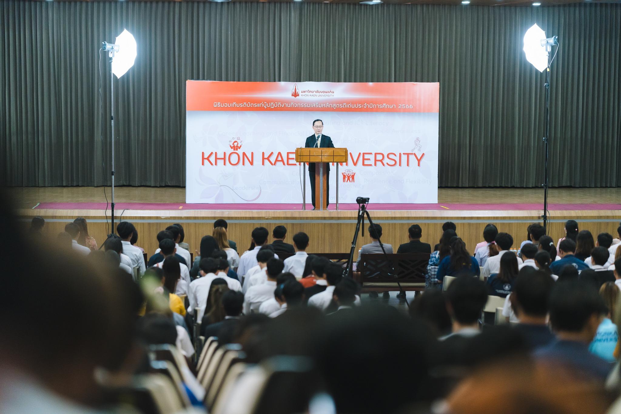 โอกาสนี้ รองศาสตราจารย์ นพ.ชาญชัย พานทองวิริยะกุล อธิการบดีมหาวิทยาลัยขอนแก่น ได้กล่าวแสดงความรู้สึกว่า “นักศึกษา ถือเป็นหัวใจหลักและเป็นทรัพยากรที่มีความสำคัญยิ่งในกระบวนการพัฒนามหาวิทยาลัย ตลอดจนส่งเสริมให้นักศึกษามีทักษะที่จำเป็นในศตวรรษที่ 21 เกิดมุมมอง และขีดความสามารถในการเป็นพลเมืองโลก (Global Perspective & Capability) ทั้งนี้นักศึกษาที่ปฏิบัติงานด้านกิจกรรมเสริมหลักสูตร ที่ได้ทุ่มเทความรู้ ความสามารถ พลังกาย พลังใจ ในการดำเนินกิจกรรมต่าง ๆ ให้ประสบความสำเร็จ สร้างชื่อเสียงให้กับมหาวิทยาลัยจนเป็นที่ประจักษ์ ทำให้นักศึกษาที่ได้รับเกียรติบัตรครั้งนี้ได้เกิดความภาคภูมิใจทั้งในตัวของนักศึกษาเอง ผู้ที่อยู่เบื้องหลัง และมหาวิทยาลัย ”