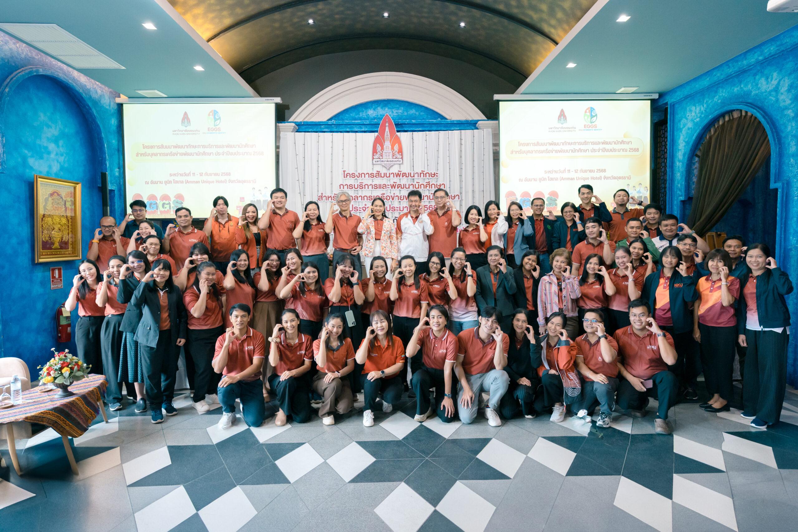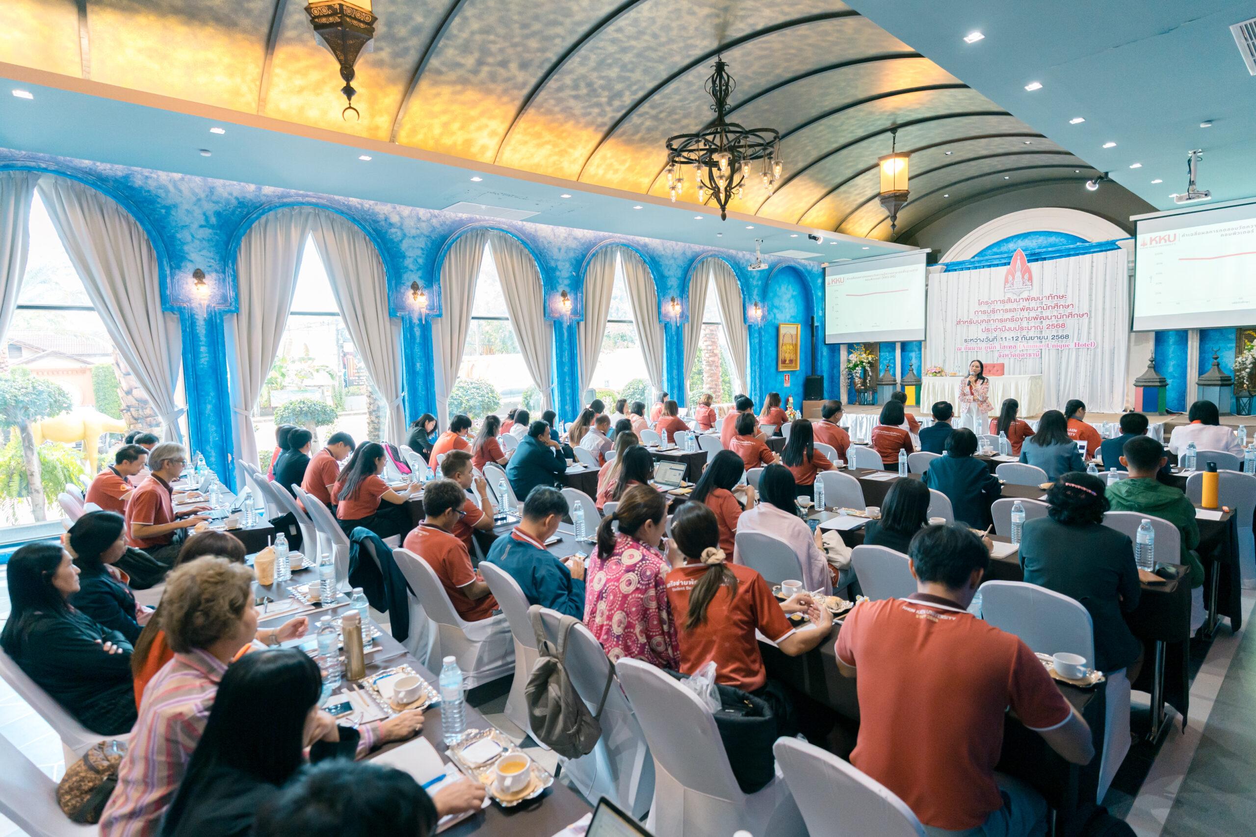 ฝ่ายกิจการนักศึกษาและนวัตวณิชย์ มหาวิทยาลัยขอนแก่น โดยกองพัฒนานักศึกษาและศิษย์เก่าสัมพันธ์ จัดสัมมนา “โครงการสัมมนาพัฒนาทักษะการบริการและพัฒนานักศึกษา สำหรับบุคลากรเครือข่ายพัฒนานักศึกษา ประจำปีงบประมาณ 2568” โดยได้รับเกียรติจากรองศาสตราจารย์ ดร.เพ็ญศรี เจริญวานิช รองอธิการบดีฝ่ายกิจการนักศึกษาและนวัตวณิชย์ ถ่ายทอดนโยบาย กิจกรรมดังกล่าวมุ่งเสริมสร้างศักยภาพ ผู้บริหารคณะ อาจารย์และผู้ปฏิบัติงานเครือข่ายด้านการพัฒนานักศึกษา ให้มีทักษะและความพร้อมในการขับเคลื่อนยุทธศาสตร์ที่สำคัญของมหาวิทยาลัย สู่เป้าหมายสร้างอัตลักษณ์นักศึกษา “EGGS” : KKU Students’Identity ระหว่างวันที่ 11-12 กันยายน 2568 ณ จังหวัดอุดรธานี