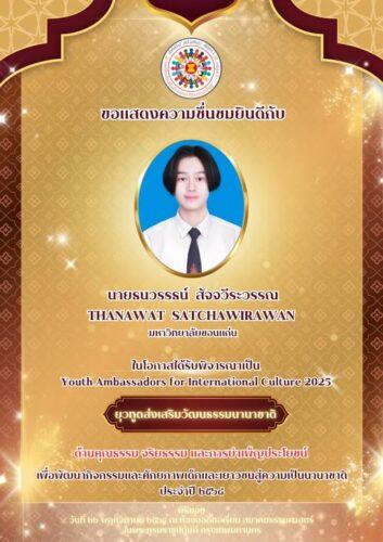 วันที่ 8 พฤศจิกายน 2568 คณะสหวิทยาการ มหาวิทยาลัยขอนแก่น ขอแสดงความยินดีและความภาคภูมิใจในความสำเร็จของ นายธนวรรธน์ สัจจวีระวรรณ นักศึกษาจากหลักสูตรเศรษฐศาสตร์ระหว่างประเทศ นวัตกรรม และความยั่งยืน ที่ได้รับการคัดเลือกให้เป็นผู้ได้รับรางวัล Youth Ambassadors for International Culture 2025 หรือ ยุวทูตส่งเสริมวัฒนธรรมนานาชาติด้านคุณธรรม จริยธรรม และการบำเพ็ญประโยชน์ ประจำปี ๒๕๖๘