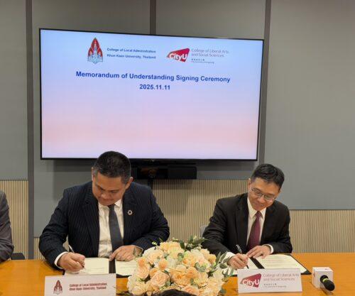 เมื่อวันที่ 13 พฤศจิกายน 2568 คณะผู้บริหารวิทยาลัยการปกครองท้องถิ่น นำโดย ผศ.ดร.ศิริศักดิ์ เหล่าจันขาม คณบดี ได้รับเชิญจาก Prof. Alfred HO คณบดี College of Liberal Arts and Social Sciences (CLASS) และผู้อำนวยการ Institute of Global Governance and Innovation for a Shared Future แห่ง City University of Hong Kong (CityUHK) (World Ranking QS#63 THE#75) จัดพิธีลงนามความร่วมมือทางวิชาการและวิจัย (MOU)