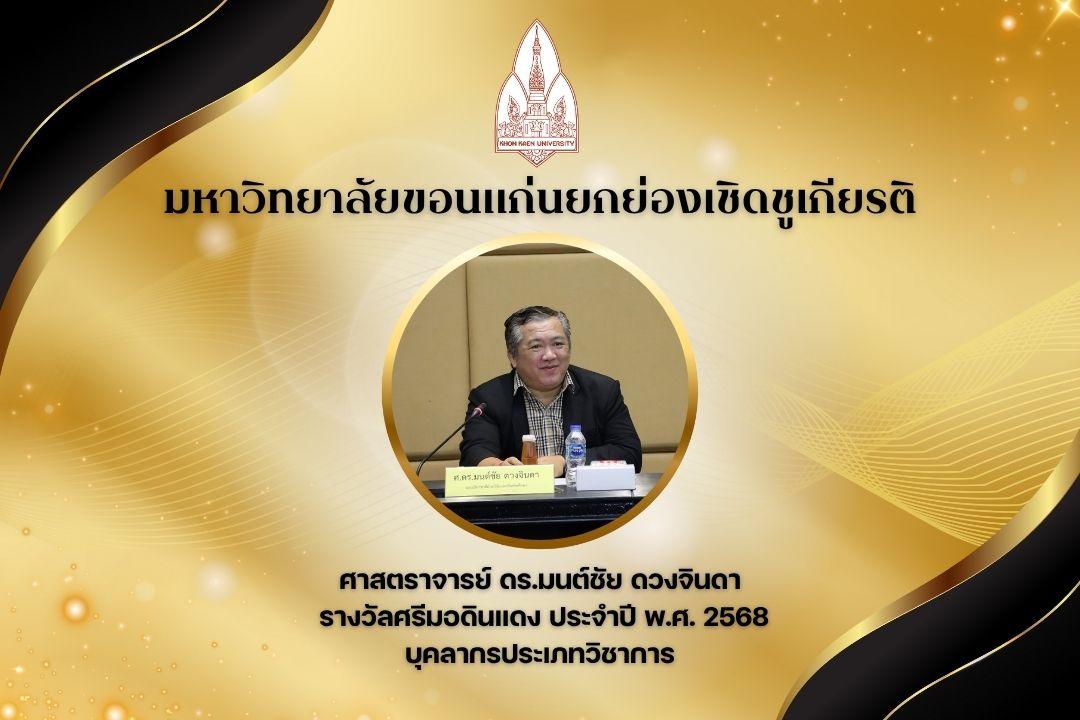 ศาสตราจารย์ ดร.มนต์ชัย ดวงจินดา คณะเกษตรศาสตร์ ผู้อุทิศตนเพื่องานวิชาการทางการเกษตรและการปรับปรุงพันธุ์สัตว์มาอย่างยาวนาน ดำรงตำแหน่งรองอธิการบดีฝ่ายวิจัยและบัณฑิตศึกษา ตั้งแต่ปี 2563-2567 และเคยเป็นคณบดีคณะเกษตรศาสตร์ตั้งแต่ปี 2555 ถึง 2562 มีผลงานโดดเด่นด้านการพันธุศาสตร์และการปรับปรุงพันธุ์สัตว์ที่ได้รับการยอมรับทั้งในระดับมหาวิทยาลัย ระดับชาติ และระดับโลก ได้รับรางวัลมากมาย อาทิ ระดับโลก อาทิ Woo-gene B&G Award (2024) จากสมาคม Asian-Australasian Association of Animal Production, รางวัลนิสิตเก่าดีเด่น สาขาวิชาการ (2562) จากสมาคมนิสิตเก่ามหาวิทยาลัยเกษตรศาสตร์, โล่เกียรติยศ “นักปรับปรุงพันธุ์สัตว์ยอดเยี่ยม” จากมหาวิทยาลัยเกษตรศาสตร์ (2557), รางวัลนักวิจัยดีเด่น ระดับทอง (2565) และระดับเงิน (2561) สาขาวิทยาศาสตร์เทคโนโลยีและวิทยาศาสตร์สุขภาพ จากมหาวิทยาลัยขอนแก่น, โล่เชิดชูเกียรติ “ผู้บริหารดีเด่น” ระดับดีเด่น สาขาวิทยาศาสตร์และเทคโนโลยี ประจำปี 2559 และ 2558 จากมหาวิทยาลัยขอนแก่น, โล่เกียรติยศ “งานวิจัยเด่น สกว.” (2555), โล่เกียรติคุณ “บุคลากรสายผู้สอนผู้มีผลการปฏิบัติงานดีเยี่ยม” (2553) เป็นต้น
