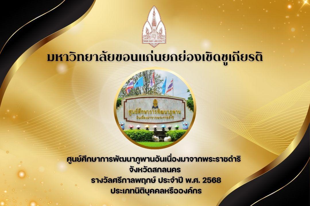 มหาวิทยาลัยขอนแก่น ประกาศเกียรติคุณบุคคลและองค์กรผู้ทำคุณประโยชน์ต่อสังคมและมหาวิทยาลัย โดยจะมีการมอบรางวัล “ศรีกาลพฤกษ์” และ “ศรีมอดินแดง” ประจำปี พ.ศ. 2568 ซึ่งผู้ได้รับการคัดเลือกในปีนี้ล้วนเป็นผู้ที่มีผลงานโดดเด่น อุทิศตนเพื่อพัฒนามหาวิทยาลัยและสังคมอย่างต่อเนื่อง โดยผู้ได้รับรางวัลทั้งหมดจะเข้ารับในพิธีพระราชทานปริญญาบัตร มหาวิทยาลัยขอนแก่น ประจำปี พ.ศ. 2568 ในวันพฤหัสบดีที่ 18 ธันวาคม 2568 และวันศุกร์ที่ 19 ธันวาคม 2568 ณ มหาวิทยาลัยขอนแก่น