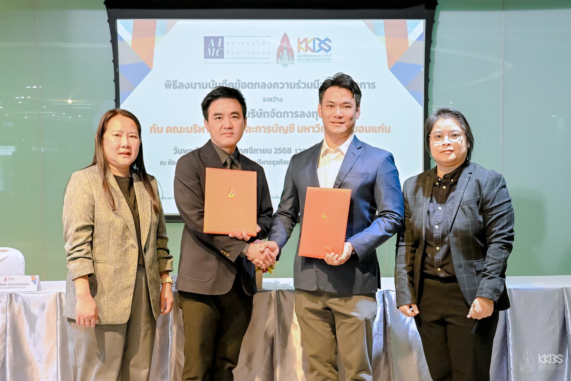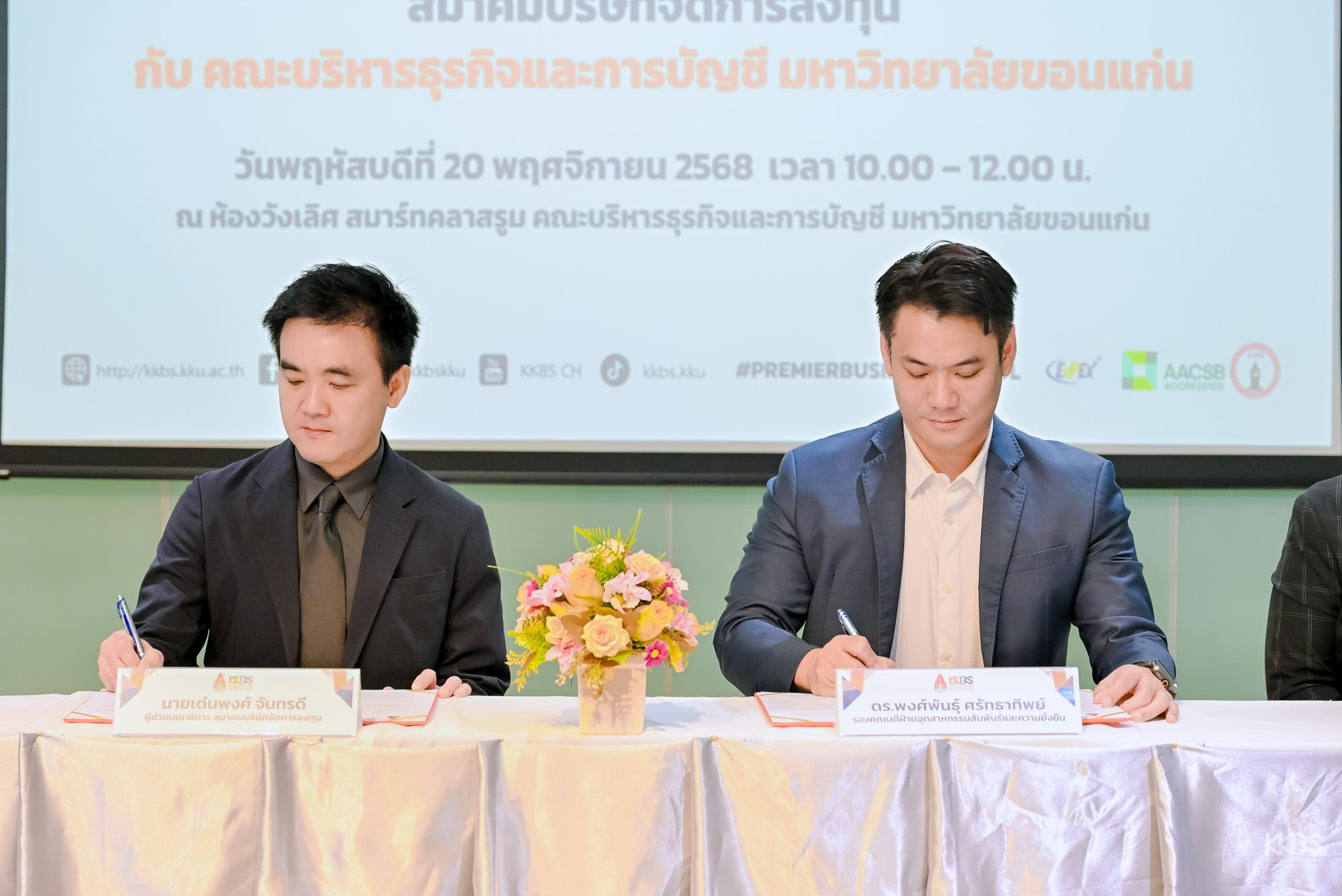 วันที่ 21 พฤศจิกายน 2568 คณะบริหารธุรกิจและการบัญชี มหาวิทยาลัยขอนแก่น จัดพิธีลงนามบันทึกข้อตกลงความร่วมมือทางวิชาการ (MOU) กับ สมาคมบริษัทจัดการลงทุน โดยในพิธีลงนามได้รับเกียรติจากผู้บริหารทั้งสองหน่วยงานร่วมเป็นสักขีพยานการลงนามในครั้งนี้ ประกอบไปด้วย ดร.พงศ์พันธุ์ ศรัทธาทิพย์ รองคณบดีฝ่ายอุตสาหกรรมสัมพันธ์และความยั่งยืน คณะบริหารธุรกิจและการบัญชี ผู้ช่วยศาสตราจารย์ สุธาสินี สุวรรณภักดิ์ ประธานหลักสูตรบริหารธุรกิจบัณฑิต สาขาวิชาการเงินและเทคโนโลยีทางการเงิน คณะบริหารธุรกิจและการบัญชี พร้อมด้วย นายเด่นพงศ์ จันทรดี ผู้ช่วยเลขาธิการสมาคมบริษัทจัดการลงทุน และ นางสาวสิริพร รัตนสุวรรณ ผู้อำนวยการสมาคมบริษัทจัดการลงทุน ณ ห้องวังเลิศ อาคาร BS.01 คณะบริหารธุรกิจและการบัญชี