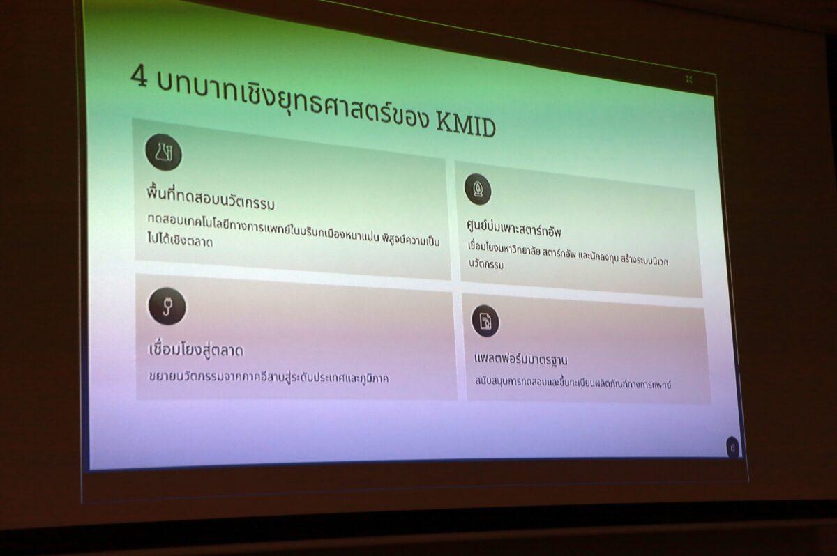 “เรามีเป้าหมายในการร้อยเรียงสิ่งที่มีอยู่แล้วในขอนแก่นให้เชื่อมโยงกัน โดยมุ่งเน้นให้เป็นศูนย์ประสานงานและพื้นที่ทดสอบนวัตกรรมจริง ขอนแก่นเป็นเมืองที่มีความหนาแน่นสูง จึงเหมาะสำหรับการพิสูจน์ความเป็นไปได้ในเชิงการตลาด ฉะนั้นเราจึงเชื่อมโยงงานวิจัยจากมหาวิทยาลัยกับการทำงานร่วมกับสตาร์ทอัพรายใหม่ๆด้านสุขภาพ และพยายามเชื่อมต่อสู่ตลาดระดับภูมิภาค เพราะถ้าทำแค่ขอนแก่นหรือในประเทศไทยเพียงอย่างเดียว มันคงไม่เพียงพอ เราจึง start small แต่คิด global”