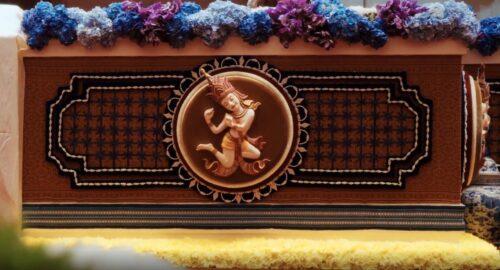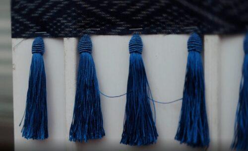 ส่วนที่สาม บริเวณแท่นประทับ ออกแบบให้เห็นถึงการประยุกต์ใช้ “ผ้าคราม” ในมิติของศิลปวัฒนธรรม โดยนำเอกลักษณ์ทางศิลปะของจังหวัดสกลนคร ซึ่งเป็นแหล่งผ้าย้อมครามสำคัญ มาถ่ายทอดอย่างสง่างาม