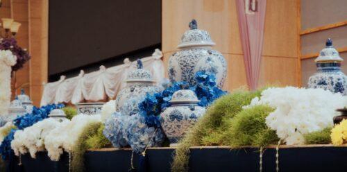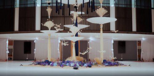 ส่วนที่สอง ภายในศูนย์ประชุมกาญจนาภิเษก ตกแต่งเส้นทางและพื้นที่ด้วยโทนสีคราม ถ่ายทอดความสุขุมลุ่มลึก ผ่านงานหัตถกรรม งานปฏิมากรรม และงานจิตรกรรม เพื่อสะท้อนอัตลักษณ์ของบัณฑิตมหาวิทยาลัยขอนแก่นที่เปี่ยมด้วยวิทยา ปัญญา และจริยา
