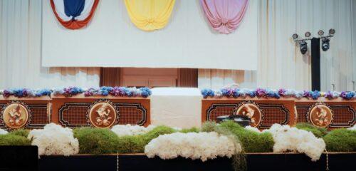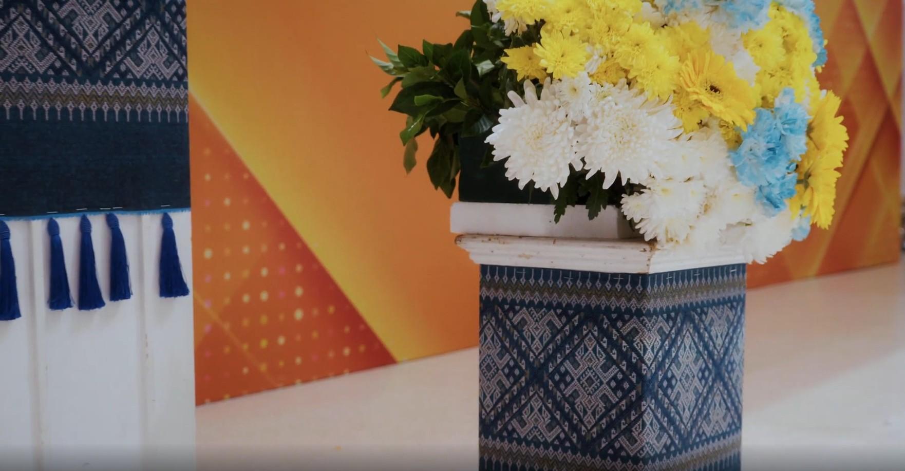ส่วนที่สาม บริเวณแท่นประทับ ออกแบบให้เห็นถึงการประยุกต์ใช้ “ผ้าคราม” ในมิติของศิลปวัฒนธรรม โดยนำเอกลักษณ์ทางศิลปะของจังหวัดสกลนคร ซึ่งเป็นแหล่งผ้าย้อมครามสำคัญ มาถ่ายทอดอย่างสง่างาม