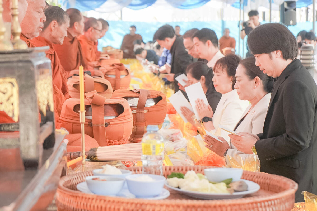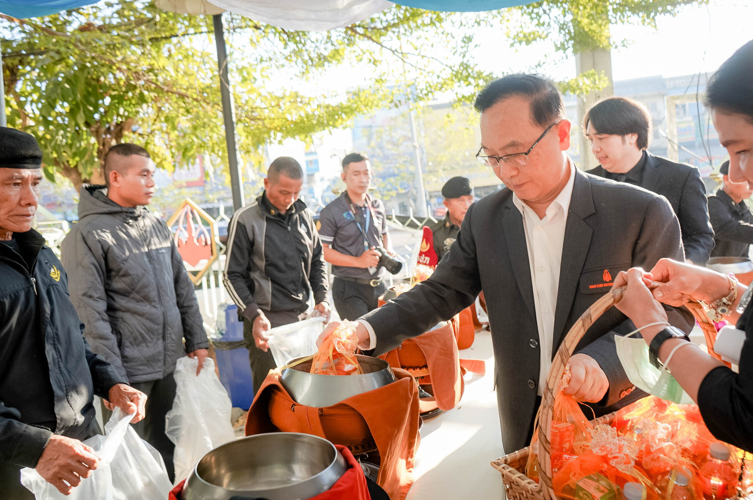 พิธีสิริมงคลเพื่อน้อมรำลึกในพระมหากรุณาธิคุณ ในช่วงเช้าเวลา 07.00 น. รศ.นพ.ชาญชัย พานทองวิริยะกุล อธิการบดี มข. ได้นำคณะผู้บริหารร่วม พิธีทำบุญตักบาตรพระภิกษุสงฆ์ จำนวน 34 รูป ณ บริเวณลานด้านหน้าพระหฤทัยสัมฤทธิ์ผล (ฝั่งทิศตะวันออกติดถนนมิตรภาพ)