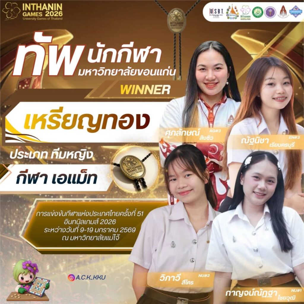 วันพุธที่ 14 มกราคม 2569 ไฮไลต์สำคัญของการแข่งขันอยู่ที่ เหรียญทองแรกของมหาวิทยาลัยขอนแก่น จากกีฬา เอแม็ท ประเภททีมหญิง ซึ่งนักกีฬาได้แสดงศักยภาพด้านการคิดวิเคราะห์ การวางแผน และการทำงานเป็นทีมอย่างยอดเยี่ยม โดยทีมเอแม็ทหญิงประกอบด้วย นางสาวณัฐนิชา เรียบครบุรี นางสาววิภาวี สีใคร นางสาวกาญจน์ณัฏฐา ไชยวุฒิ และนางสาวศุภลักษณ์ สิงซิว สามารถเอาชนะคู่แข่งและคว้าเหรียญทองมาครองได้สำเร็จ