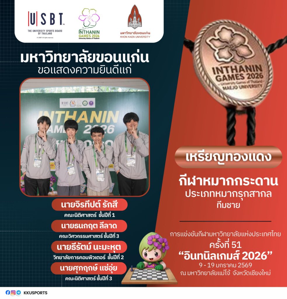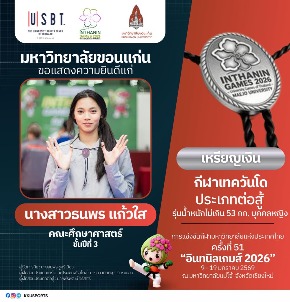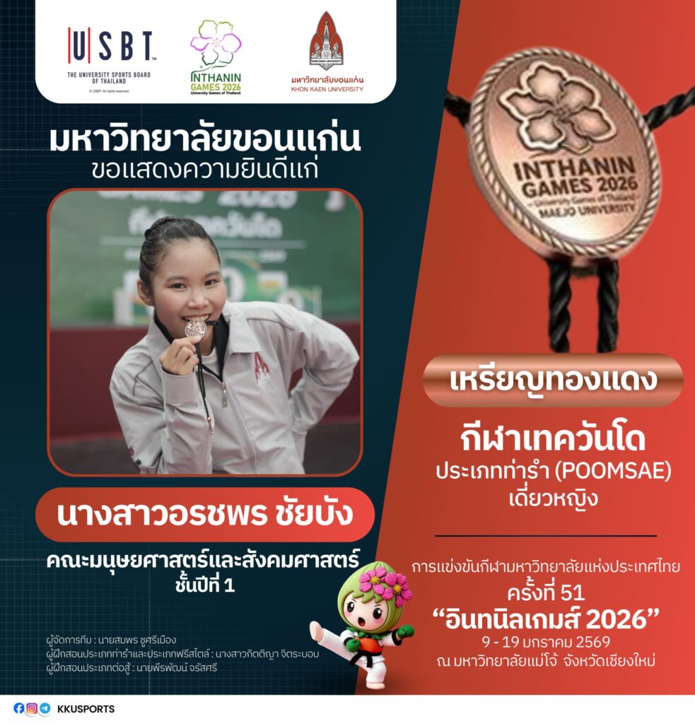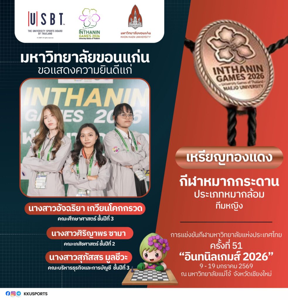 ทั้งนี้ มหาวิทยาลัยขอนแก่นขอเชิญชวนชาวมอดินแดงและประชาชนร่วมส่งกำลังใจเชียร์ทัพนักกีฬามหาวิทยาลัยขอนแก่น ในการแข่งขันกีฬามหาวิทยาลัยแห่งประเทศไทย ครั้งที่ 51 “อินทนิลเกมส์ 2026” ซึ่งจัดขึ้นระหว่างวันที่ 9–19 มกราคม 2569 ณ มหาวิทยาลัยแม่โจ้ จังหวัดเชียงใหม่ เพื่อร่วมสร้างความภาคภูมิใจให้กับสถาบันอย่างต่อเนื่อง และติดตามข่าวสารเพิ่มเติมได้ที่ Facebook : ทัพนักกีฬามหาวิทยาลัยขอนแก่น