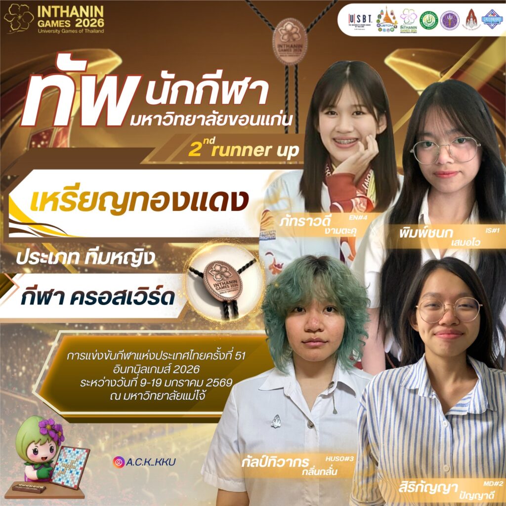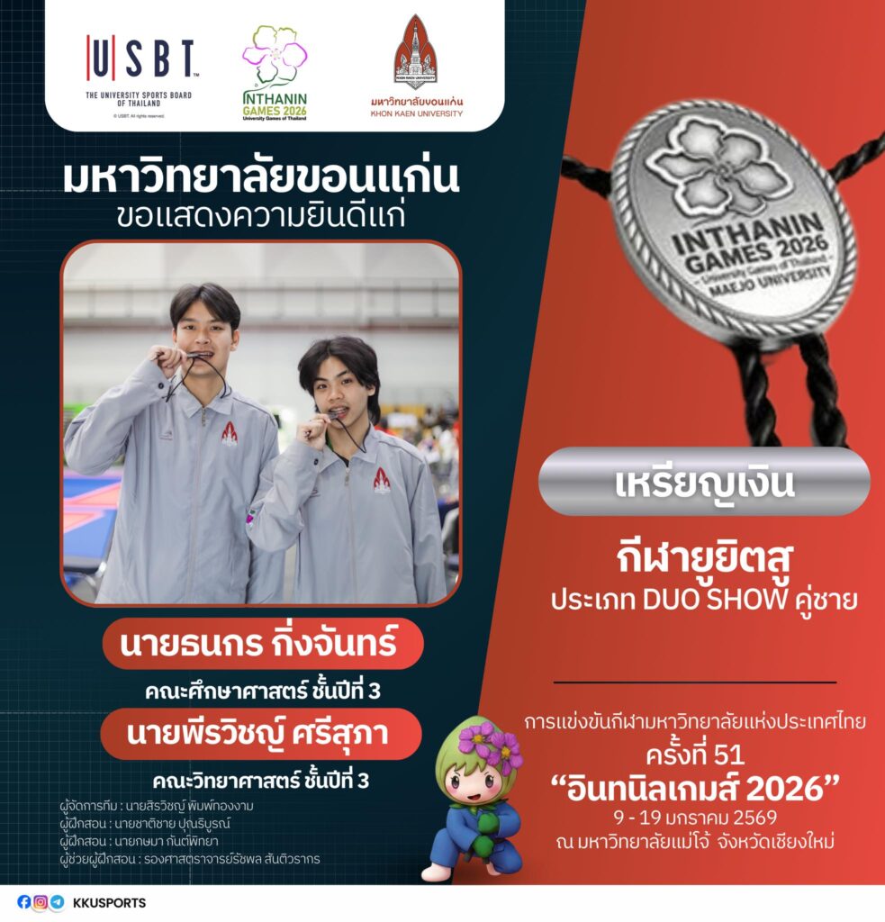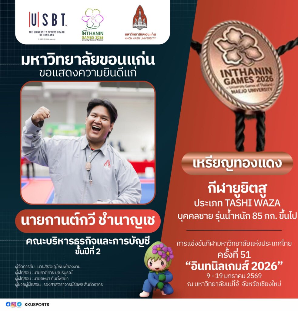 ทั้งนี้ มหาวิทยาลัยขอนแก่นขอเชิญชวนชาวมอดินแดงและประชาชนร่วมส่งกำลังใจเชียร์ทัพนักกีฬามหาวิทยาลัยขอนแก่น ในการแข่งขันกีฬามหาวิทยาลัยแห่งประเทศไทย ครั้งที่ 51 “อินทนิลเกมส์ 2026” ซึ่งจัดขึ้นระหว่างวันที่ 9–19 มกราคม 2569 ณ มหาวิทยาลัยแม่โจ้ จังหวัดเชียงใหม่ เพื่อร่วมสร้างความภาคภูมิใจให้กับสถาบันอย่างต่อเนื่อง และติดตามข่าวสารเพิ่มเติมได้ที่ Facebook : ทัพนักกีฬามหาวิทยาลัยขอนแก่น