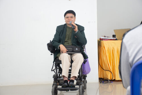 เติมแรงบันดาลใจ – ขยายช่องทางตลาด จุดเด่นสำคัญของกิจกรรมในครั้งนี้ คือการได้รับเกียรติจาก นางสาวเกษราภรณ์ หลวงจันทร์ ประธานกลุ่มล้อไม้เฟอร์นิเจอร์ จังหวัดขอนแก่น มาร่วมเป็นวิทยากรต้นแบบ แชร์ประสบการณ์ก้าวข้ามขีดจำกัดทางร่างกายสู่ความสำเร็จในธุรกิจ เพื่อสร้างแรงบันดาลใจให้กับผู้เข้าอบรมในทุกพื้นที่