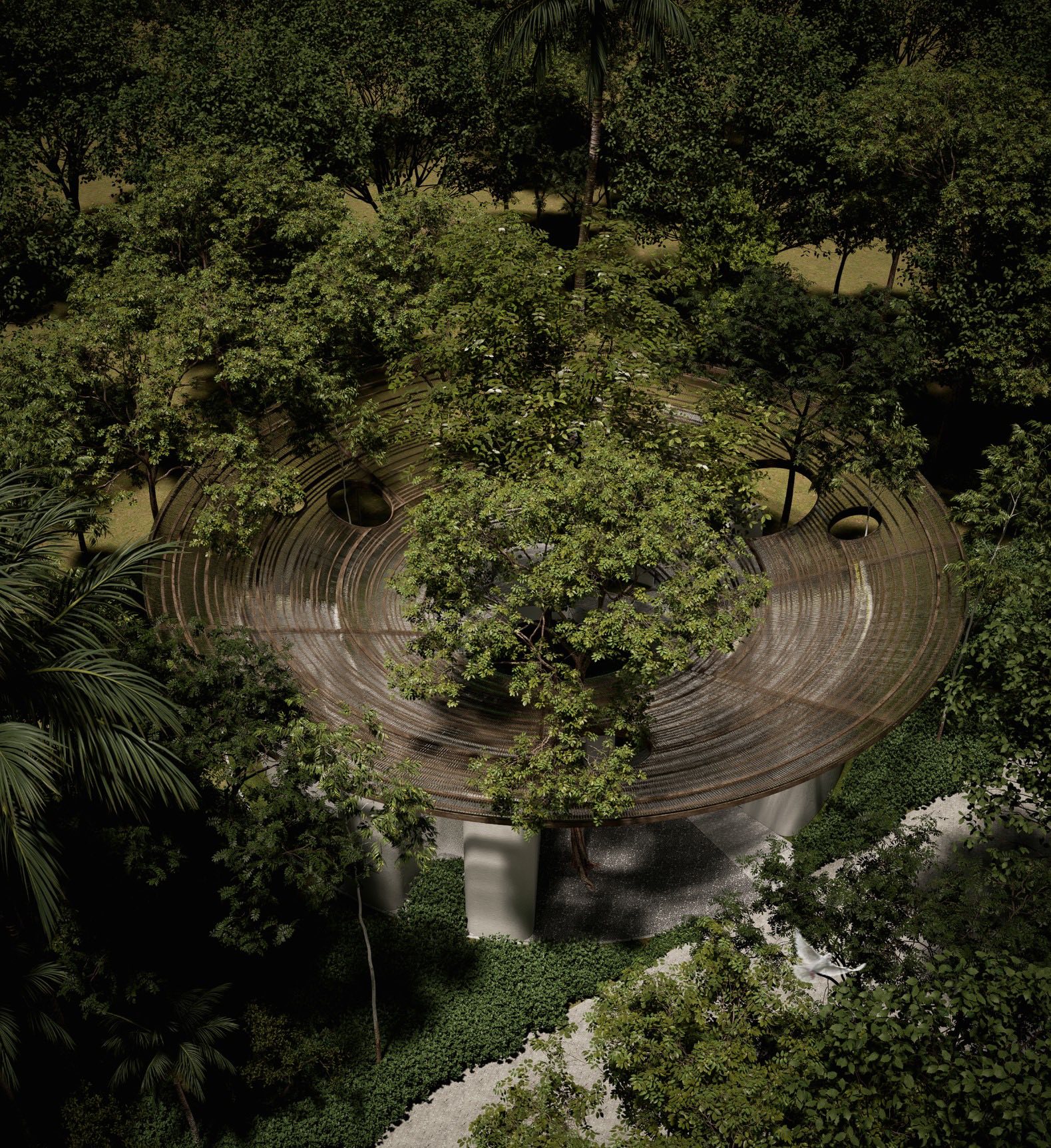 การออกแบบที่เปิดโล่งนี้ยังช่วยให้แสงธรรมชาติและการระบายอากาศไหลผ่านเข้าสู่ทุกส่วนของห้องน้ำได้อย่างทั่วถึง ส่งเสริมความปลอดภัยและความสบายในการใช้งาน ขณะเดียวกัน วงปีที่ซ้อนกันยังทำหน้าที่แบ่งพื้นที่ใช้งานอย่างเป็นธรรมชาติโดยไม่ต้องพึ่งพาผนังทึบ ทำให้ผู้ใช้งานรับรู้ถึงการมีอยู่ของกันและกัน เกิดการเฝ้าระวังทางสังคม (Natural Surveillance) และช่วยเปลี่ยนภาพลักษณ์ของห้องน้ำสาธารณะให้เป็นพื้นที่ที่เปิดเผย น่าใช้งาน และปลอดภัยยิ่งขึ้น