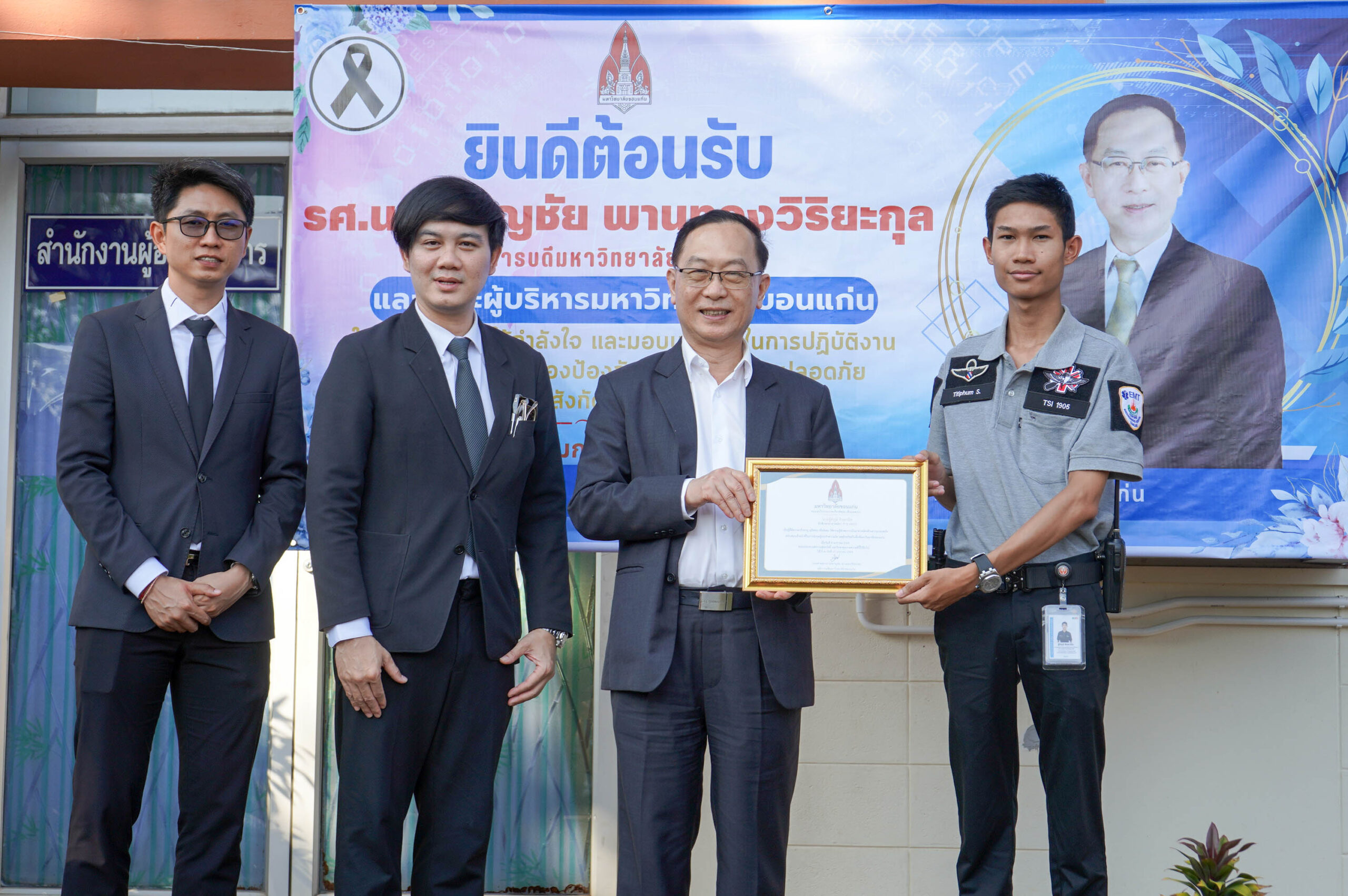 วันที่ 27 มกราคม 2569 รองศาสตราจารย์ นายแพทย์ชาญชัย พานทอง วิริยะกุล อธิการบดีมหาวิทยาลัยขอนแก่น พร้อมด้วยคณะผู้บริหารมหาวิทยาลัย ได้พบปะบุคลากรกองป้องกันและรักษาความปลอดภัย และงานบริการยานพาหนะ กองบริหารงานกลาง มหาวิทยาลัยขอนแก่น เพื่อมอบนโยบายในการปฏิบัติงาน พร้อมให้โอวาท ส่งความปรารถนาดี และเป็นขวัญกำลังใจแก่บุคลากรด้านการบริการยานพาหนะ และบุคลากรด้านการรักษาความปลอดภัย
