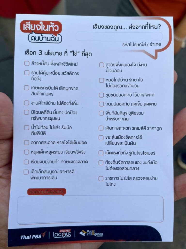 การสำรวจครั้งนี้ใช้เครื่องมือเชิงนโยบายที่พัฒนาโดย Thai PBS Locals เปิดโอกาสให้ประชาชนเลือก 3 นโยบายจาก 20 นโยบาย ที่ตอบโจทย์ชีวิตจริงมากที่สุด โดยผลลัพธ์ที่ได้ไม่เพียงเป็นข้อมูลเชิงปริมาณ แต่สะท้อน “เสียงจริงจากหัวใจของชาวบ้าน” อย่างรอบด้าน