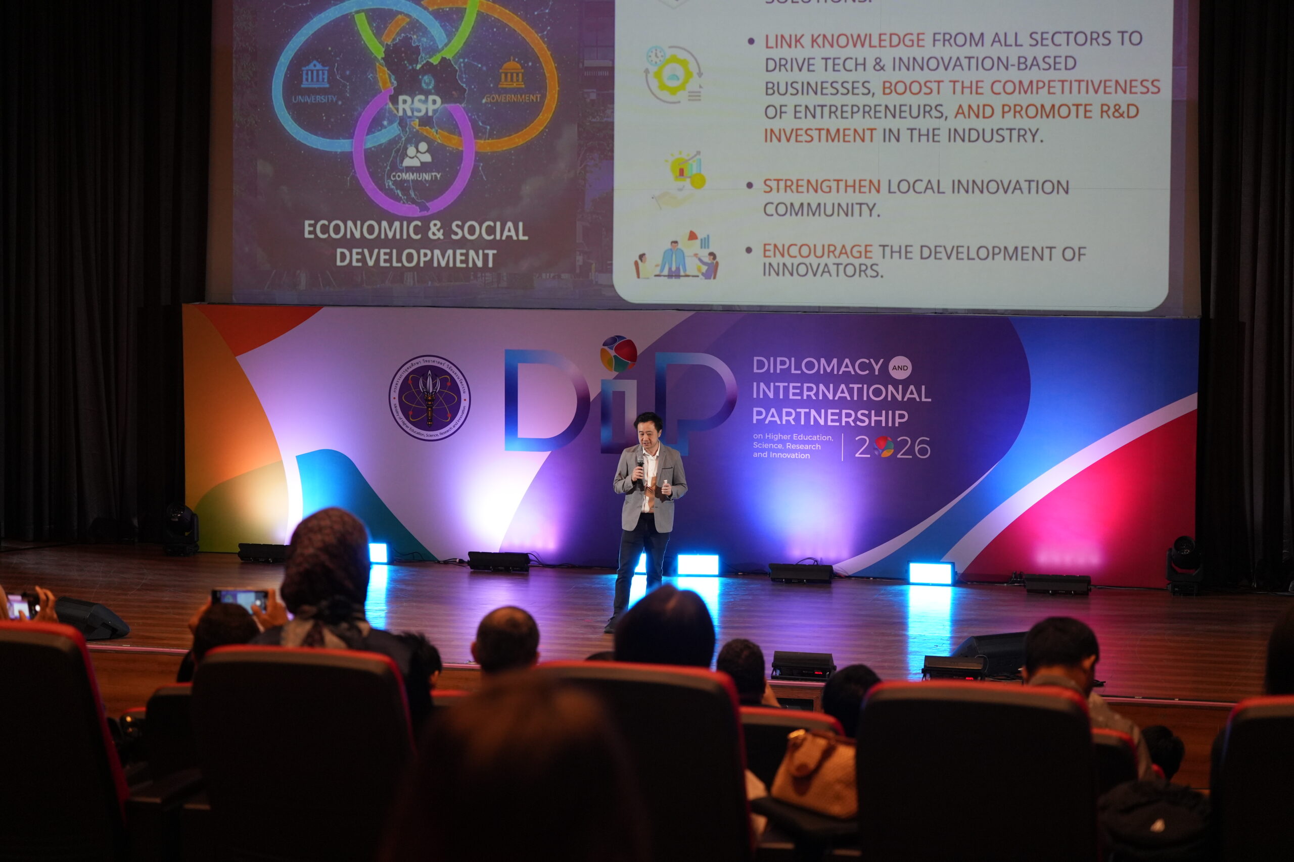 สำหรับโครงการ “Diplomacy and International Partnership Forum on Higher Education, Science, Research and Innovation 2026″เป็นการรวมตัวของผู้แทนจากสถานเอกอัครราชทูตทั้ง 32 ประเทศ ครอบคลุมทั้งกลุ่มยุโรป เอเชีย อาเซียน และภูมิภาคอื่นๆ ทั่วโลก โดยมีทั้งเอกอัครราชทูตและรองหัวหน้าคณะผู้แทนทางการทูตเข้าร่วมเป็นจำนวนมาก นอกจากนี้ยังมีผู้บริหารระดับรองอธิการบดีและผู้ช่วยอธิการบดีจากมหาวิทยาลัยชั้นนำ 15 แห่งทั่วประเทศ รวมถึงตัวแทนจากสถาบันวิจัยและหน่วยงานรัฐยุทธศาสตร์ 14 แห่ง อาทิ สำนักงานพัฒนาวิทยาศาสตร์และเทคโนโลยีแห่งชาติ (สวทช.) หน่วยบริหารและจัดการทุนด้านการพัฒนาระดับพื้นที่ (บพท.) และสำนักงานพัฒนาเทคโนโลยีอวกาศและภูมิสารสนเทศ (GISTDA) โดยมุ่งเน้นการบูรณาการองค์ความรู้ทางวิทยาศาสตร์ เทคโนโลยีและนวัตกรรมกับภูมิปัญญาท้องถิ่น