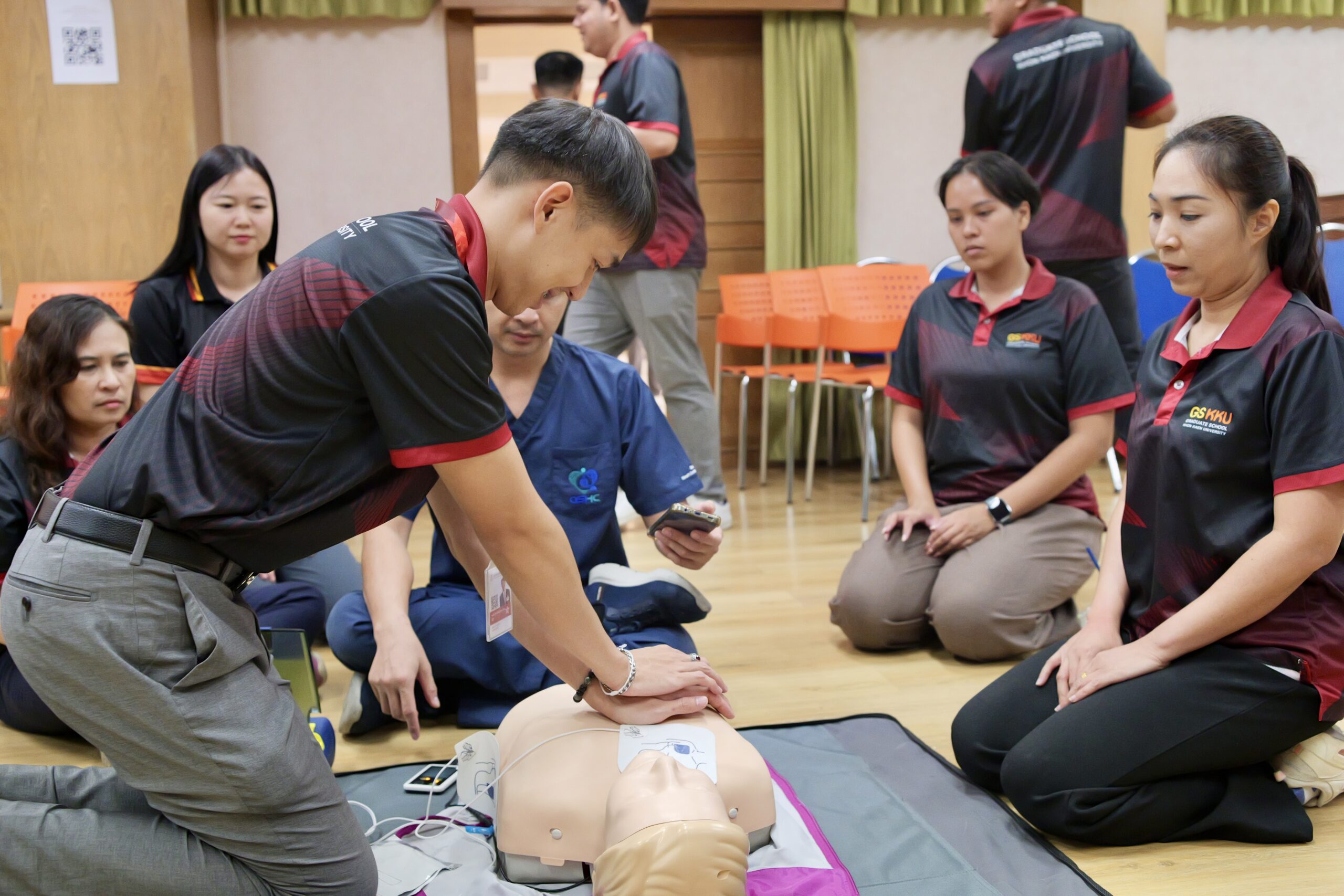 ส่วนในช่วงบ่าย เป็นการอบรมเชิงปฏิบัติการด้าน การช่วยฟื้นคืนชีพขั้นพื้นฐาน (CPR) และการใช้เครื่องกระตุกหัวใจไฟฟ้าชนิดอัตโนมัติ (AED) โดยได้รับความอนุเคราะห์ทีมวิทยากรผู้เชี่ยวชาญจาก ศูนย์หัวใจสิริกิติ์ ภาคตะวันออกเฉียงเหนือ มาตั้งฐานการเรียนรู้ ตั้งแต่การประเมินความปลอดภัยของสิ่งแวดล้อม การประเมินความรู้สึกผู้ป่วย การแจ้งเหตุสายด่วน 1669 ตลอดจนการฝึกปฏิบัติกดหน้าอกอย่างมีประสิทธิภาพสลับกับการใช้เครื่อง AED บนหุ่นจำลอง