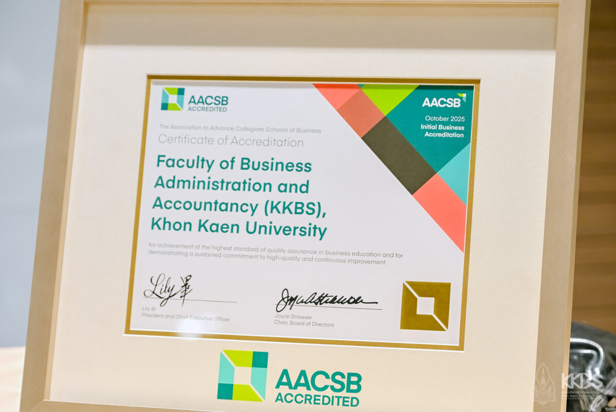 คณบดี ระบุเพิ่มเติมอีกว่า ปัจจุบันคณะฯ ได้รับการรับรองมาตรฐานสากลอย่างเป็นทางการจากสถาบันการรับรองมาตรฐานการศึกษาทางด้านบริหารธุรกิจในระดับสากล หรือที่เรียกว่า Association to Advance Collegiate Schools of Business : AACSB เมื่อเดือนพฤศจิกายน 2568 ที่ผ่านมา ให้เป็นหนึ่งในคณะบริหารธุรกิจและการบัญชีชั้นนำระดับโลก นับเป็นสถาบันการศึกษาแห่งแรกในภาคตะวันออกเฉียงเหนือ และเป็นสถาบันการศึกษาลำดับที่ 9 ของประเทศไทย ที่ได้รับการรับรองมาตรฐานระดับโลกนี้ โดยมีเพียงไม่ถึง 6% ของสถาบันการศึกษาด้านธุรกิจทั่วโลก จากกว่า 70 ประเทศที่ได้รับการรับรองจาก AACSB ซึ่งเป็นเครื่องหมายคุณภาพการศึกษาสูงสุดที่ได้รับการยอมรับทั่วโลก ซึ่งถือเป็นก้าวสำคัญในการยกระดับคุณภาพการศึกษา การเรียนการสอน และงานวิจัยของคณะฯ มีคุณภาพเท่าเทียมกับสถาบันชั้นนำระดับโลก