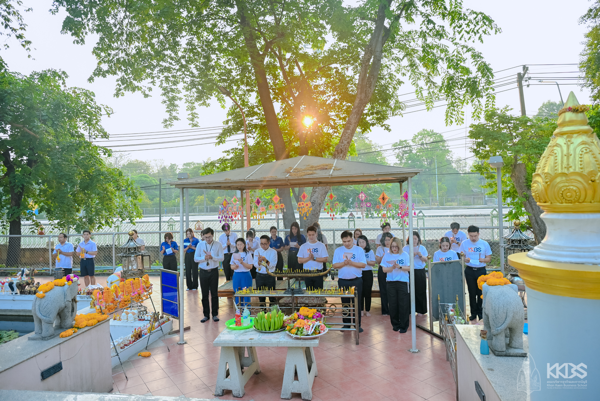 โดยกิจกรรมเริ่มต้นด้วยคณะผู้บริหาร คณาจารย์ บุคลากร และนักศึกษา ประกอบพิธีสักการะเจ้าพ่อมอดินแดง ณ ศาลเจ้าพ่อมอดินแดง มหาวิทยาลัยขอนแก่น และพิธีบวงสรวงสักการะพระภูมิเจ้าที่คณะบริหารธุรกิจและการบัญชี เพื่อไหว้สักการะ ถวาย ดอกไม้ ธูปเทียน และเครื่องบวงสรวงต่าง ๆ เพื่อขอพรให้ท่านช่วยปกป้องคุ้มครองบุคลากรตลอดจนนักศึกษาทุกคนประสบแต่ความสุขความเจริญ จากนั้นเป็นพิธีทำบุญตักบาตรและพิธีเจริญพระพุทธมนต์ โดยมีพระเดชพระคุณ พระครูสิริสารเมธี เจ้าคณะอำเภอหนองเรือ (ธ) วัดสว่างดอนยาง เป็นประธานฝ่ายสงฆ์ พร้อมด้วยพระสงฆ์จากวัดป่าแสงอรุณ จำนวน 9 รูป เมตตาออกรับบิณฑบาต จากคณะผู้บริหาร คณาจารย์ บุคลากร และผู้เข้าร่วมงาน ณ ลานอเนกประสงค์ ชั้น 1