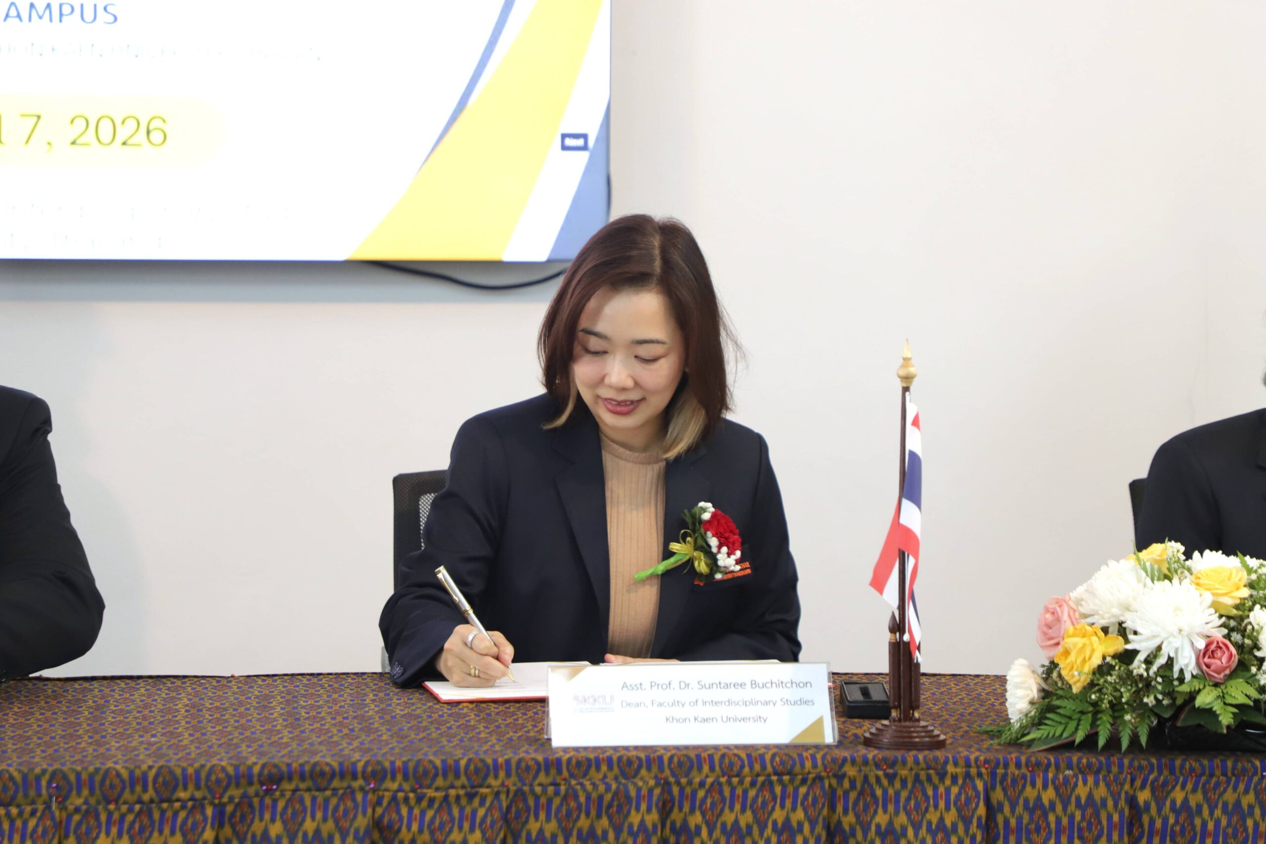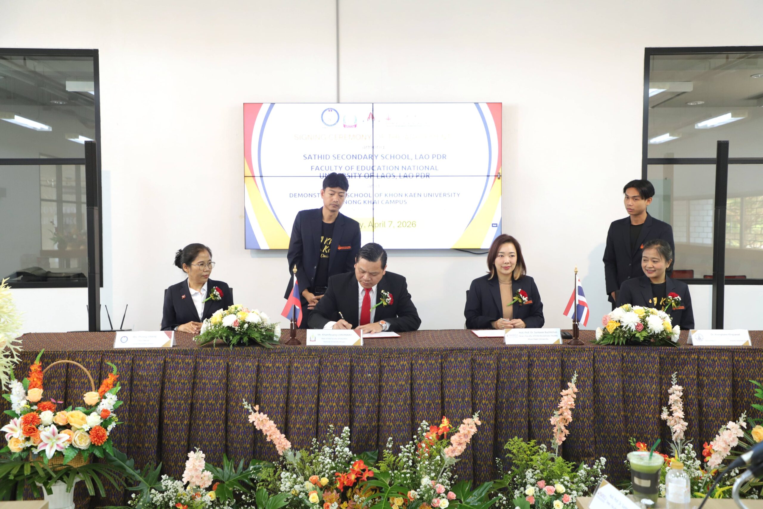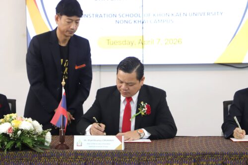 โรงเรียนสาธิตมหาวิทยาลัยขอนแก่น วิทยาเขตหนองคาย จัดโครงการลงนามความร่วมมือทางวิชาการ Academic Cooperation Agreement Signing Ceremony ร่วมกับ โรงเรียนมัธยมสมบูรณ์สาธิต และ คณะศึกษาศาสตร์ มหาวิทยาลัยแห่งชาติลาว การลงนามครั้งนี้ได้รับเกียรติจาก ผู้ช่วยศาสตราจารย์ ดร.สุนทรี บูชิตชน คณบดีคณะสหวิทยาการ มหาวิทยาลัยขอนแก่น และ อาจารย์ ดร.กรองแก้ว กิ่งสวัสดิ์ ผู้อำนวยการโรงเรียนสาธิตมหาวิทยาลัยขอนแก่น วิทยาเขตหนองคาย เป็นผู้ลงนามร่วมกับ Mr. Khamfeuang LORVANXAY คณบดีคณะศึกษาศาสตร์ มหาวิทยาลัยแห่งชาติลาว และ Mrs. Phonsy ORAINE ผู้อำนวยการโรงเรียนมัธยมสมบูรณ์สาธิต มหาวิทยาลัยแห่งชาติลาว พร้อมด้วยคณะผู้บริหาร อาจารย์ และเจ้าหน้าที่จากทั้งสามสถาบันร่วมเป็นสักขีพยานในครั้งนี้ ซึ่งจัดขึ้นในวันอังคารที่ 7 เมษายน 2569 ณ ห้อง Innovation Park ชั้น 1 อาคารเรียนรวมและปฏิบัติการ 2 คณะสหวิทยาการ มหาวิทยาลัยขอนแก่น