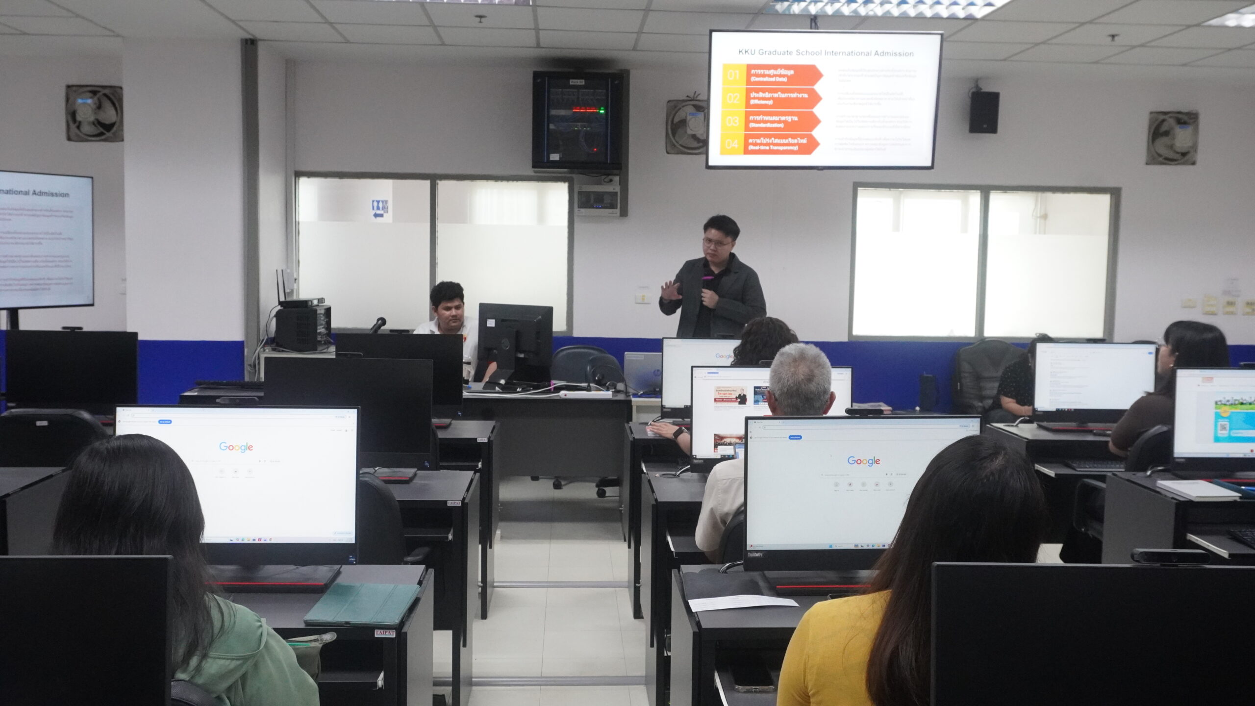 บัณฑิตวิทยาลัยจัดอบรมเชิงปฏิบัติการ “การใช้งานระบบรับสมัครนักศึกษาชาวต่างชาติระดับบัณฑิตศึกษาออนไลน์ (GSIA)” เมื่อวันที่ 27 เมษายน พ.ศ. 2569 ณ ห้องปฏิบัติการคอมพิวเตอร์ 3 ชั้น 4 อาคารศูนย์สารสนเทศ โดยมี ผศ.ดร.กรชวัล ชายผา ผู้ช่วยคณบดีฝ่ายยุทธศาสตร์ดิจิทัล กล่าวเปิดการอบรม และนายธนชัย ขจรมณี จากบริษัท Imaginic เป็นวิทยากรบรรยายพิเศษ