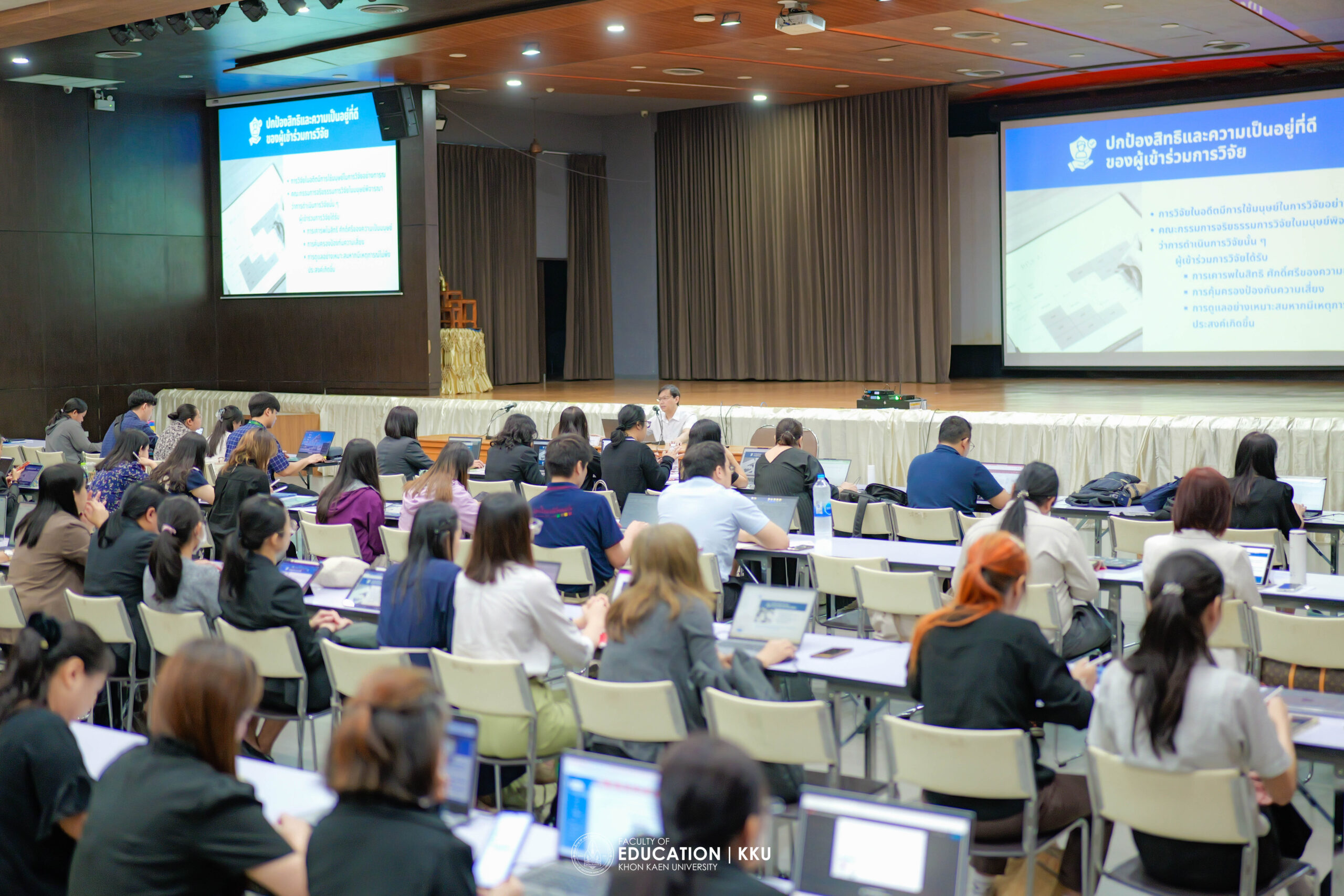 คณะศึกษาศาสตร์ มหาวิทยาลัยขอนแก่น ผนึกกำลังร่วมกับศูนย์จริยธรรมการวิจัยในมนุษย์ มหาวิทยาลัยขอนแก่น จัดการอบรมเชิงปฏิบัติการในหัวข้อ “จริยธรรมการวิจัยในมนุษย์ (Human subject protection)” (ED รุ่นที่ 2) เมื่อวันที่ 27 เมษายน 2569 ณ ห้องประชุมสายสุรี จุติกุล เพื่อขับเคลื่อนยุทธศาสตร์ด้านการวิจัยที่มุ่งเน้นการคุ้มครองสิทธิมนุษยชนและยกระดับคุณภาพงานวิชาการ โดยได้รับเกียรติจาก ศาสตราจารย์ นายแพทย์พลพันธ์ บุญมาก ผู้อำนวยการศูนย์จริยธรรมการวิจัยในมนุษย์ เป็นประธานในพิธีเปิดและวิทยากรหลัก เพื่อสร้างความเข้าใจที่ถูกต้องเกี่ยวกับมาตรฐานสากลที่นักวิจัยทุกคนต้องยึดถือเป็นแนวทางปฏิบัติร่วมกันอย่างเคร่งครัด