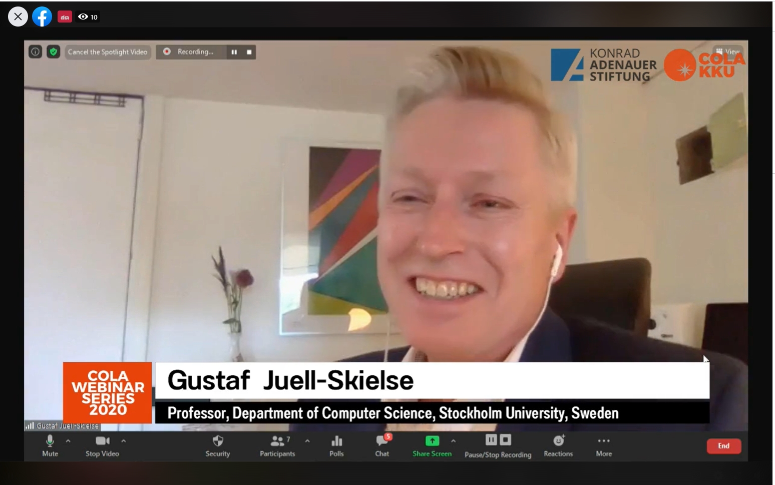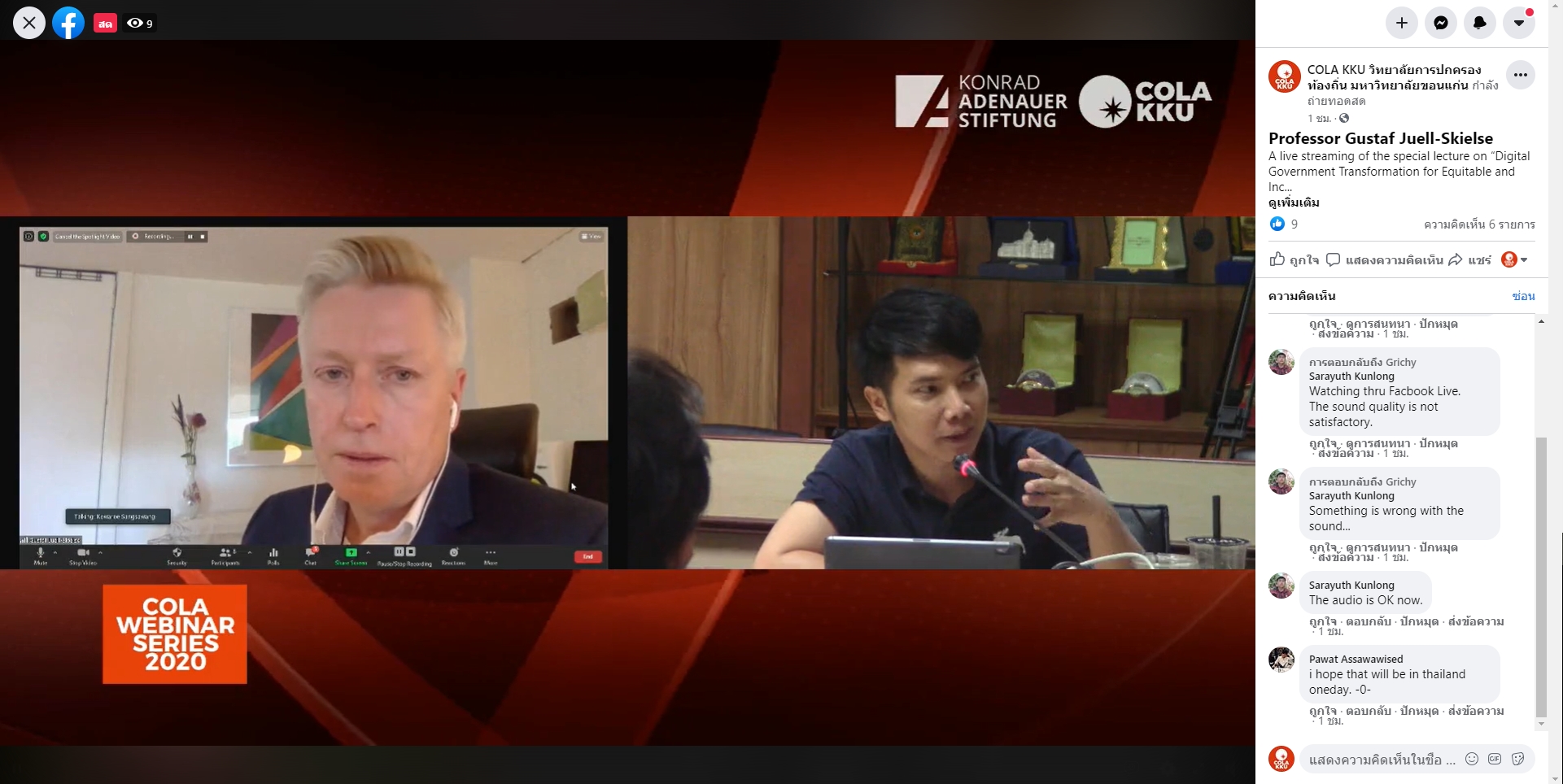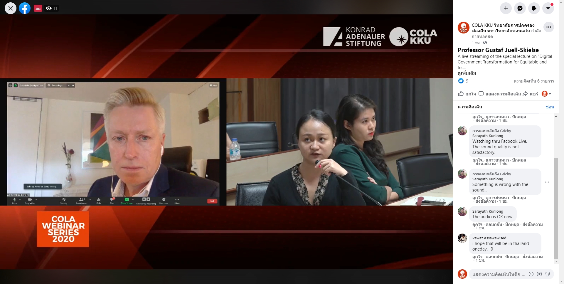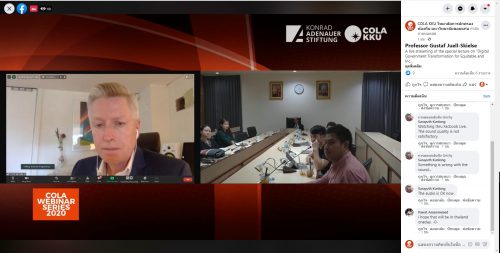 วันพฤหัสบดีที่ 17 กันยายน  2563  วิทยาลัยการปกครองท้องถิ่น ร่วมกับ มูลนิธิ คอนราด อาเดนาวร์ ประจำประเทศไทย นำเสนอการสัมมนา COLA Webinar Series 2020 ครั้งที่สาม โดยได้รับเกียรติการบรรยายจากวิทยากร Associate Prof. Gustaf Juell-Skielse ในหัวข้อ “Digital Government Transformation for Equitable and Inclusive Public Services” ซึ่งนำเสนอบน Zoom และหน้า Facebook