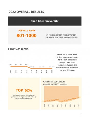 “ตั้งแต่มีการจัดอันดับโดย QS World University Rankings อันดับของมหาวิทยาลัยขอนแก่นดีขึ้นมาโดยตลอด จนปัจจุบันถือเป็นลำดับของการจัดอันดับโดยการอิงกลุ่มของ QS World University Rankings สูงที่สุดตั้งแต่ตั้งมหาวิทยาลัยขึ้นมา ลำดับตามเปอร์เซ็นไทล์เมื่อย้อนไป 10 ปีก่อน เราอยู่เปอร์เซ็นไทล์ที่ 81.3 หมายความว่าหากมี 100 มหาวิทยาลัย เราอยู่อันดับที่ 80 กว่า เมื่อมี 1,000 มหาวิทยาลัย เข้าร่วมการจัดอันดับ เราอยู่ในอันดับที่ 800 และจากผลการจัดอันดับโดย QS World University Rankings ปี 2021 เราอยู่ลำดับเปอร์เซ็นไทล์ที่ 67.5 ปี 2022 นี้ เราอยู่อันดับเปอร์เซ็นไทล์ที่ 61.6 หมายความว่า ถ้า 1,300 มหาวิทยาลัย คิดเป็น 100% เราจะอยู่อันดับที่ 61.6 ซึ่งเป็นอันดับที่สูงขึ้น” ผศ.นพ.ธรา ธรรมโรจน์ กล่าว