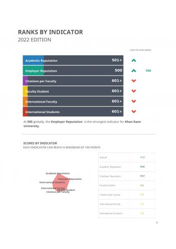 การขยับอันดับที่สูงขึ้นของมหาวิทยาลัยขอนแก่น จาก QS World University Rankings 2022 นี้อยู่ภายใต้การพิจารณาที่เข้มข้นจากตัวชี้วัด 6 ประกอบด้วย Academic reputation ความมีชื่อเสียงด้านวิชาการ 40% Employer reputation การเป็นที่ยอมรับบัณฑิตจากนายจ้าง 10% Student-to-faculty ratio สัดส่วนของอาจารย์ต่อนักศึกษา 20% Citations per faculty สัดส่วนจำนวนการอ้างอิงต่อผลงานวิจัยที่ได้รับการตีพิมพ์ 20% International faculty ratio สัดส่วนของอาจารย์ชาวต่างชาติ 5% international student ratio สัดส่วนของนักศึกษาชาวต่างชาติ 5% รวมเป็น 100 คะแนน จากสัดส่วนการพิจารณาคะแนน สังเกตได้ว่าการจัดอันดับดังกล่าว ให้ความสำคัญกับ ความเป็นที่รู้จัก และ การยอมรับในอัตราส่วนที่สูงมาก